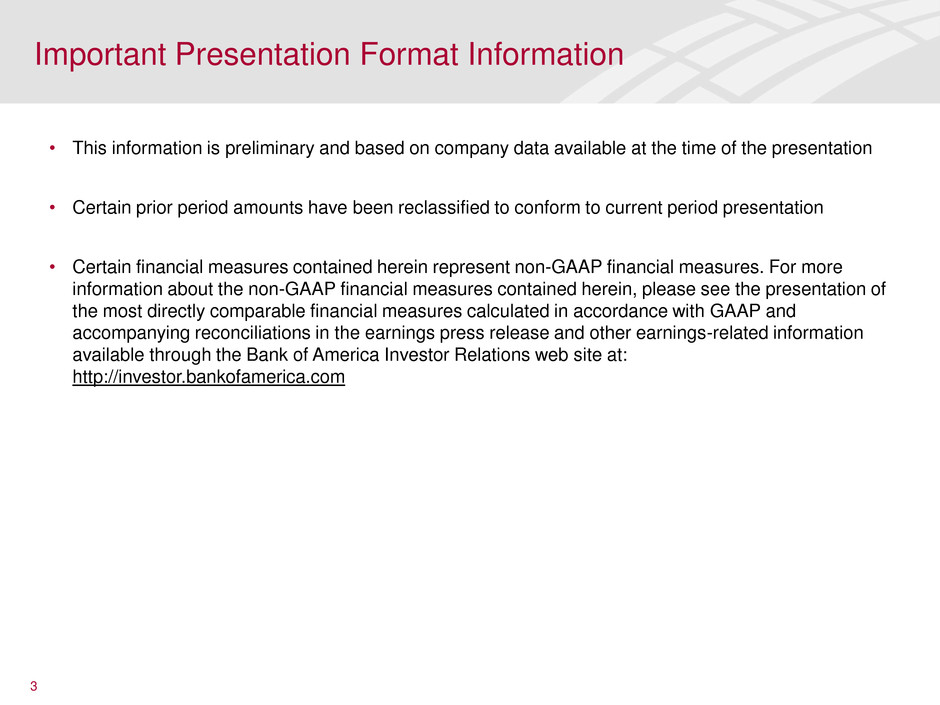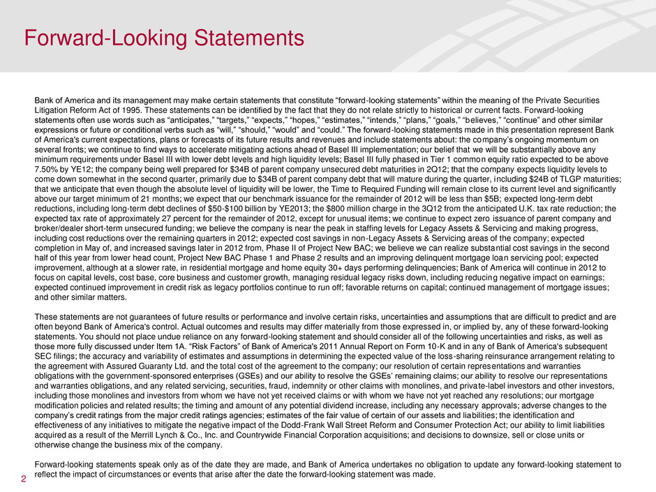 Bank of America and its management may make certain statements that constitute “forward-looking statements” within the meaning of the Private Securities Litigation Reform Act of 1995. These statements can be identified by the fact that they do not relate strictly to historical or current facts. Forward-looking statements often use words such as “anticipates,” “targets,” “expects,” “hopes,” “estimates,” “intends,” “plans,” “goals,” “believes,” “continue” and other similar expressions or future or conditional verbs such as “will,” “should,” “would” and “could.” The forward-looking statements made in this presentation represent Bank of America's current expectations, plans or forecasts of its future results and revenues and include statements about: the company’s ongoing momentum on several fronts; we continue to find ways to accelerate mitigating actions ahead of Basel III implementation; our belief that we will be substantially above any minimum requirements under Basel III with lower debt levels and high liquidity levels; Basel III fully phased in Tier 1 common equity ratio expected to be above 7.50% by YE12; the company being well prepared for $34B of parent company unsecured debt maturities in 2Q12; that the company expects liquidity levels to come down somewhat in the second quarter, primarily due to $34B of parent company debt that will mature during the quarter, including $24B of TLGP maturities; that we anticipate that even though the absolute level of liquidity will be lower, the Time to Required Funding will remain close to its current level and significantly above our target minimum of 21 months; we expect that our benchmark issuance for the remainder of 2012 will be less than $5B; expected long-term debt reductions, including long-term debt declines of $50-$100 billion by YE2013; the $800 million charge in the 3Q12 from the anticipated U.K. tax rate reduction; the expected tax rate of approximately 27 percent for the remainder of 2012, except for unusual items; we continue to expect zero issuance of parent company and broker/dealer short-term unsecured funding; we believe the company is near the peak in staffing levels for Legacy Assets & Servicing and making progress, including cost reductions over the remaining quarters in 2012; expected cost savings in non-Legacy Assets & Servicing areas of the company; expected completion in May of, and increased savings later in 2012 from, Phase II of Project New BAC; we believe we can realize substantial cost savings in the second half of this year from lower head count, Project New BAC Phase 1 and Phase 2 results and an improving delinquent mortgage loan servicing pool; expected improvement, although at a slower rate, in residential mortgage and home equity 30+ days performing delinquencies; Bank of America will continue in 2012 to focus on capital levels, cost base, core business and customer growth, managing residual legacy risks down, including reducing negative impact on earnings; expected continued improvement in credit risk as legacy portfolios continue to run off; favorable returns on capital; continued management of mortgage issues; and other similar matters. These statements are not guarantees of future results or performance and involve certain risks, uncertainties and assumptions that are difficult to predict and are often beyond Bank of America's control. Actual outcomes and results may differ materially from those expressed in, or implied by, any of these forward-looking statements. You should not place undue reliance on any forward-looking statement and should consider all of the following uncertainties and risks, as well as those more fully discussed under Item 1A. “Risk Factors” of Bank of America's 2011 Annual Report on Form 10-K and in any of Bank of America's subsequent SEC filings; the accuracy and variability of estimates and assumptions in determining the expected value of the loss-sharing reinsurance arrangement relating to the agreement with Assured Guaranty Ltd. and the total cost of the agreement to the company; our resolution of certain representations and warranties obligations with the government-sponsored enterprises (GSEs) and our ability to resolve the GSEs’ remaining claims; our ability to resolve our representations and warranties obligations, and any related servicing, securities, fraud, indemnity or other claims with monolines, and private-label investors and other investors, including those monolines and investors from whom we have not yet received claims or with whom we have not yet reached any resolutions; our mortgage modification policies and related results; the timing and amount of any potential dividend increase, including any necessary approvals; adverse changes to the company’s credit ratings from the major credit ratings agencies; estimates of the fair value of certain of our assets and liabilities; the identification and effectiveness of any initiatives to mitigate the negative impact of the Dodd-Frank Wall Street Reform and Consumer Protection Act; our ability to limit liabilities acquired as a result of the Merrill Lynch & Co., Inc. and Countrywide Financial Corporation acquisitions; and decisions to downsize, sell or close units or otherwise change the business mix of the company. Forward-looking statements speak only as of the date they are made, and Bank of America undertakes no obligation to update any forward-looking statement to reflect the impact of circumstances or events that arise after the date the forward-looking statement was made. 2 Forward-Looking Statements