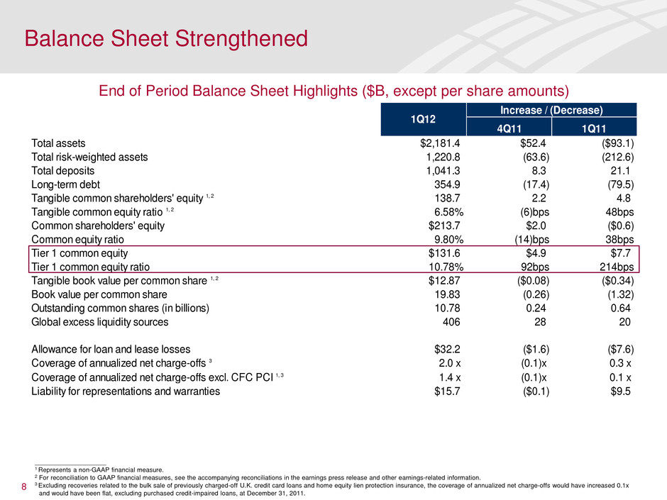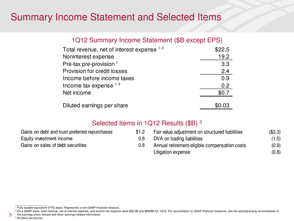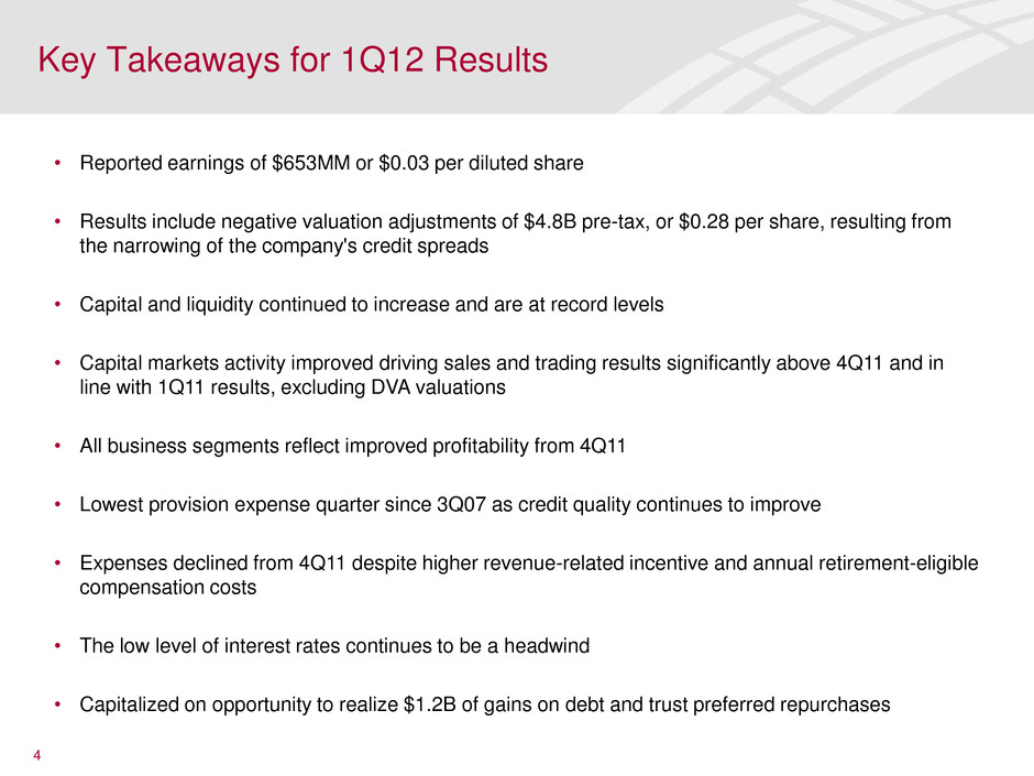 Key Takeaways for 1Q12 Results • Reported earnings of $653MM or $0.03 per diluted share • Results include negative valuation adjustments of $4.8B pre-tax, or $0.28 per share, resulting from the narrowing of the company's credit spreads • Capital and liquidity continued to increase and are at record levels • Capital markets activity improved driving sales and trading results significantly above 4Q11 and in line with 1Q11 results, excluding DVA valuations • All business segments reflect improved profitability from 4Q11 • Lowest provision expense quarter since 3Q07 as credit quality continues to improve • Expenses declined from 4Q11 despite higher revenue-related incentive and annual retirement-eligible compensation costs • The low level of interest rates continues to be a headwind • Capitalized on opportunity to realize $1.2B of gains on debt and trust preferred repurchases 4