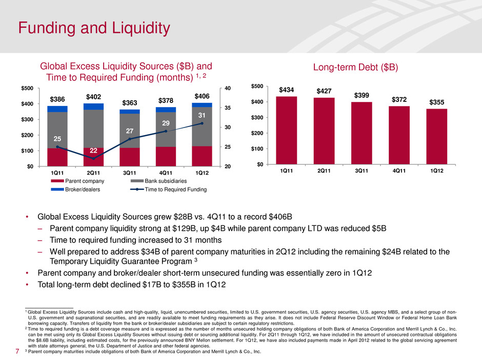 Tier 1 Common Equity Ratio Improved 92bps in 1Q12 • Tier 1 common equity ratio increased 92bps from 4Q11 to 10.78% driven by capital actions in the quarter, continued reduction of risk-weighted assets and net income earned – In 1Q12 employees were paid a portion of 2011 incentive compensation in stock, increasing the Tier 1 common equity ratio 7bps – Liability management through debt and trust preferred repurchases generated 13bps improvement in the Tier 1 common equity ratio – Risk-weighted assets declined $64B during the quarter improving the Tier 1 common equity ratio 52bps Improvement was driven by lower loan and commitment levels and optimization of off-balance sheet over-the-counter assets – The $3.3B pre-tax negative FVO valuation adjustment does not impact regulatory capital • Basel III fully phased-in Tier 1 common equity ratio expected to be above 7.50% by YE12 2 Basel I Tier 1 Common Ratio Roll-forward 6 8.23% 8.65% 9.86% 0.07% 0.13% 0.52% 0.20% 10.78% 2Q11 3Q11 4Q11 Employee Share Issuance Liability Management RWA Reduction Earnings 1Q12 1 ____________________ 1 Excludes impact of debt and trust preferred repurchases. 2 We expect Basel III Tier 1 common ratio estimates to evolve over time along with the Basel III rules. Changes in businesses and economic conditions will impact these estimates. In addition to Basel I requirements and capital ratios, these estimates assist management, investors and analysts in assessing capital adequacy and comparability under the proposed Basel III capital standards to other financial services companies. We will continue to evaluate the potential impact of the proposed rules and anticipate we will be in compliance with any final rules by the projected implementation date. Estimate also assumes approval of all regulatory models.