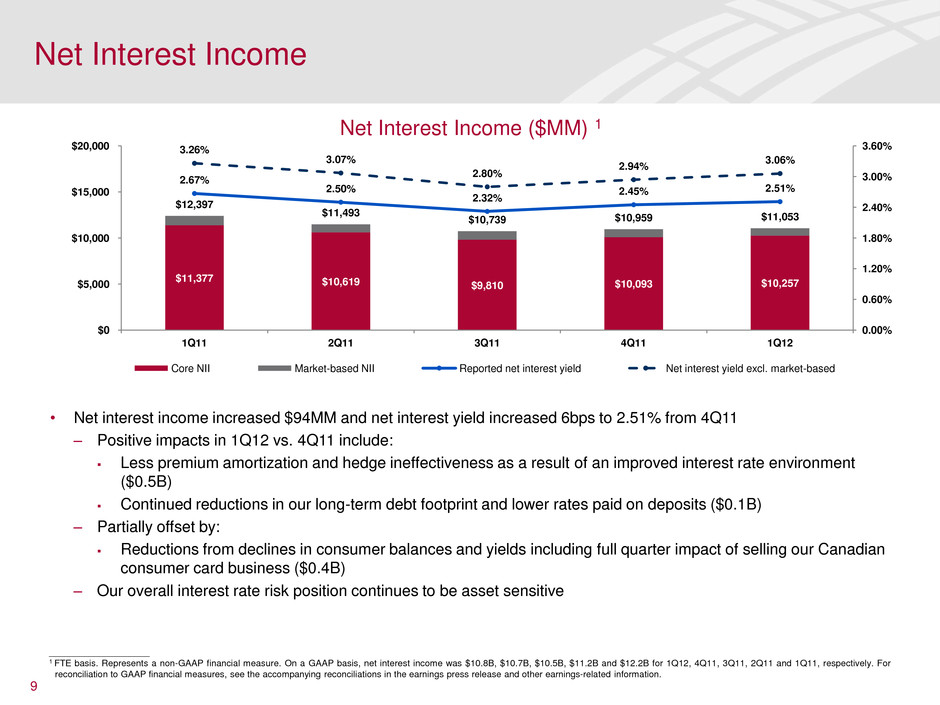 ____________________ 1 Represents a non-GAAP financial measure. 2 For reconciliation to GAAP financial measures, see the accompanying reconciliations in the earnings press release and other earnings-related information. 3 Excluding recoveries related to the bulk sale of previously charged-off U.K. credit card loans and home equity lien protection insurance, the coverage of annualized net charge-offs would have increased 0.1x and would have been flat, excluding purchased credit-impaired loans, at December 31, 2011. End of Period Balance Sheet Highlights ($B, except per share amounts) 8 Balance Sheet Strengthened 4Q11 1Q11 Total assets $2,181.4 $52.4 ($93.1) Total risk-weighted assets 1,220.8 (63.6) (212.6) Total deposits 1,041.3 8.3 21.1 Long-term debt 354.9 (17.4) (79.5) Tangible common shareholders' equity 1, 2 138.7 2.2 4.8 Tangible common equity ratio 1, 2 6.58% (6)bps 48bps Common shareholders' equity $213.7 $2.0 ($0.6) Common equity ratio 9.80% (14)bps 38bps Tier 1 common equity $131.6 $4.9 $7.7 Tier 1 common equity ratio 10.78% 92bps 214bps Tangible book value per common share 1, 2 $12.87 ($0.08) ($0.34) Book value per common share 19.83 (0.26) (1.32) Outstanding common shares (in billions) 10.78 0.24 0.64 Global excess liquidity sources 406 28 20 Allowance for loan and lease losses $32.2 ($1.6) ($7.6) Coverage of annualized net charge-offs 3 2.0 x (0.1)x 0.3 x Coverage of annualized net charge-offs excl. CFC PCI 1, 3 1.4 x (0.1)x 0.1 x Liability for representations and warranties $15.7 ($0.1) $9.5 1Q12 Increase / (Decrease)