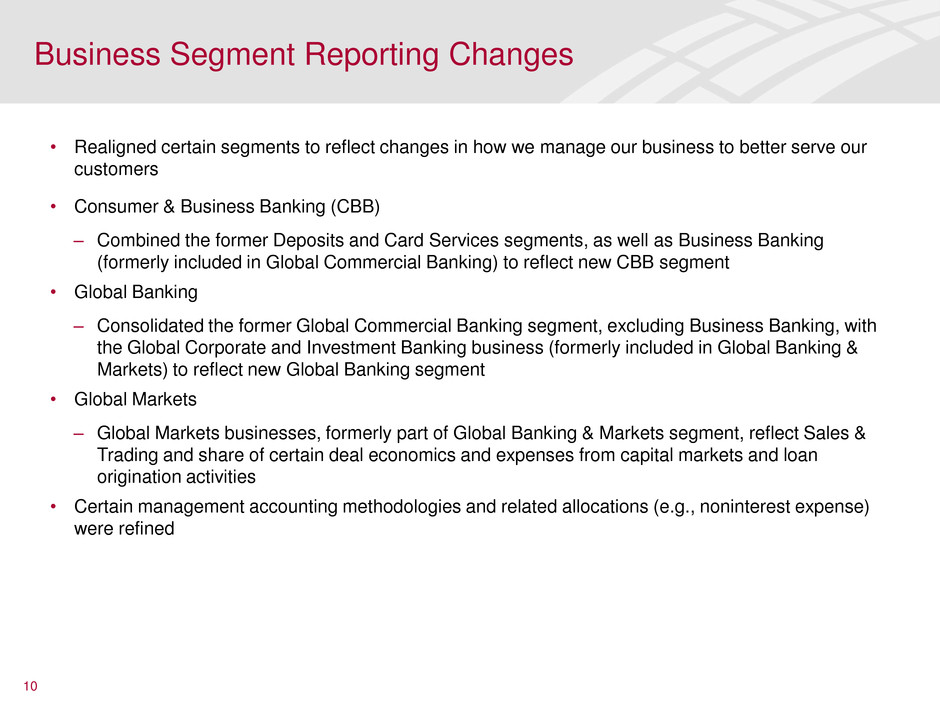Business Segment Reporting Changes 10 • Realigned certain segments to reflect changes in how we manage our business to better serve our customers • Consumer & Business Banking (CBB) ‒ Combined the former Deposits and Card Services segments, as well as Business Banking (formerly included in Global Commercial Banking) to reflect new CBB segment • Global Banking ‒ Consolidated the former Global Commercial Banking segment, excluding Business Banking, with the Global Corporate and Investment Banking business (formerly included in Global Banking & Markets) to reflect new Global Banking segment • Global Markets ‒ Global Markets businesses, formerly part of Global Banking & Markets segment, reflect Sales & Trading and share of certain deal economics and expenses from capital markets and loan origination activities • Certain management accounting methodologies and related allocations (e.g., noninterest expense) were refined
