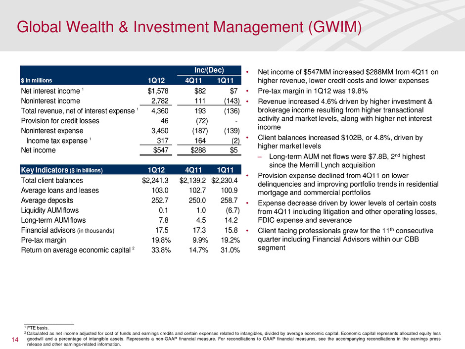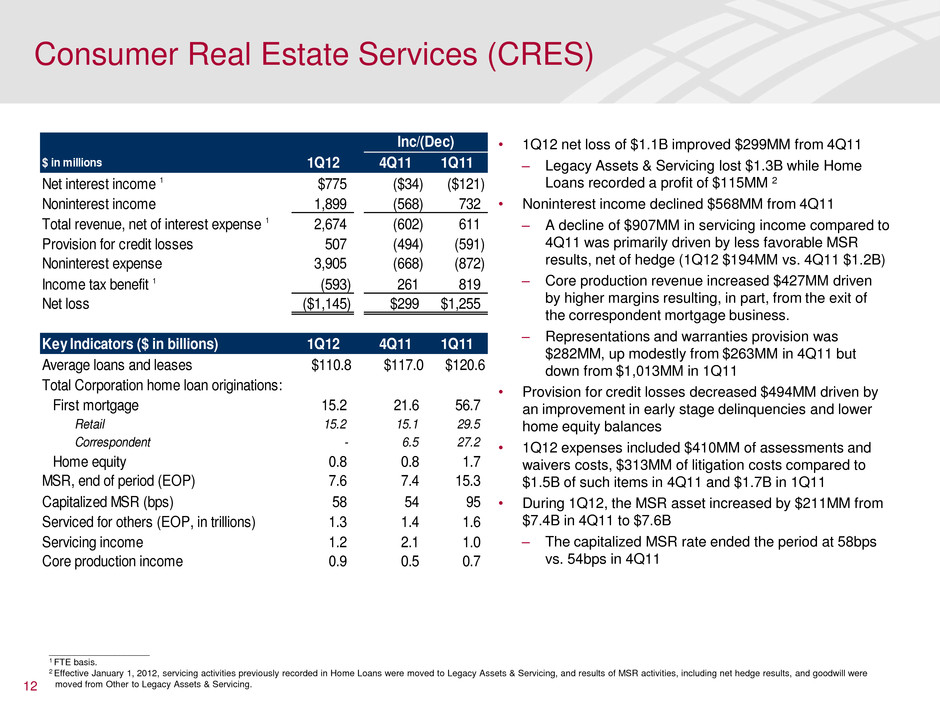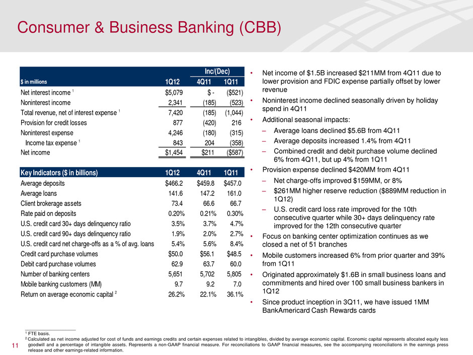 11 • Net income of $1.5B increased $211MM from 4Q11 due to lower provision and FDIC expense partially offset by lower revenue • Noninterest income declined seasonally driven by holiday spend in 4Q11 • Additional seasonal impacts: – Average loans declined $5.6B from 4Q11 – Average deposits increased 1.4% from 4Q11 – Combined credit and debit purchase volume declined 6% from 4Q11, but up 4% from 1Q11 • Provision expense declined $420MM from 4Q11 – Net charge-offs improved $159MM, or 8% – $261MM higher reserve reduction ($889MM reduction in 1Q12) – U.S. credit card loss rate improved for the 10th consecutive quarter while 30+ days delinquency rate improved for the 12th consecutive quarter • Focus on banking center optimization continues as we closed a net of 51 branches • Mobile customers increased 6% from prior quarter and 39% from 1Q11 • Originated approximately $1.6B in small business loans and commitments and hired over 100 small business bankers in 1Q12 • Since product inception in 3Q11, we have issued 1MM BankAmericard Cash Rewards cards Consumer & Business Banking (CBB) $ in millions 1Q12 4Q11 1Q11 Net interest income 1 $5,079 $ - ($521) Noninterest income 2,341 (185) (523) Total revenue, net of interest expense 1 7,420 (185) (1,044) Provision for credit losses 877 (420) 216 Noninterest expense 4,246 (180) (315) Income tax expense 1 843 204 (358) Net income $1,454 $211 ($587) Key Indicators ($ in billions) 1Q12 4Q11 1Q11 Average deposits $466.2 $459.8 $457.0 Average loans 141.6 147.2 161.0 Client brokerage assets 73.4 66.6 66.7 Rate paid on deposits 0.20% 0.21% 0.30% U.S. credit card 30+ days delinquency ratio 3.5% 3.7% 4.7% U.S. credit card 90+ days delinquency ratio 1.9% 2.0% 2.7% U.S. credit card net charge-offs as a % of avg. loans 5.4% 5.6% 8.4% Credit card purchase volumes $50.0 $56.1 $48.5 Debit card purchase volumes 62.9 63.7 60.0 Number of banking c nters 5,651 5,702 5,805 Mobile banking custo ers (MM) 9.7 9.2 7.0 Return on average economic capital 2 26.2% 22.1% 36.1% Inc/(Dec) ____________________ 1 FTE basis. 2 Calculated as net income adjusted for cost of funds and earnings credits and certain expenses related to intangibles, divided by average economic capital. Economic capital represents allocated equity less goodwill and a percentage of intangible assets. Represents a non-GAAP financial measure. For reconciliations to GAAP financial measures, see the accompanying reconciliations in the earnings press release and other earnings-related information.