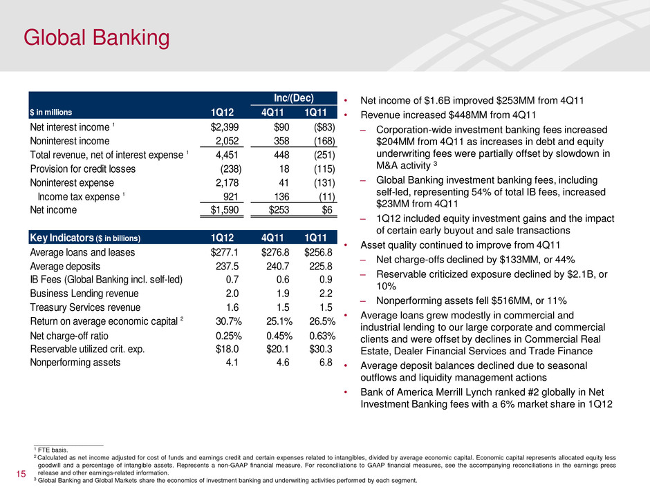 14 • Net income of $547MM increased $288MM from 4Q11 on higher revenue, lower credit costs and lower expenses • Pre-tax margin in 1Q12 was 19.8% • Revenue increased 4.6% driven by higher investment & brokerage income resulting from higher transactional activity and market levels, along with higher net interest income • Client balances increased $102B, or 4.8%, driven by higher market levels – Long-term AUM net flows were $7.8B, 2nd highest since the Merrill Lynch acquisition • Provision expense declined from 4Q11 on lower delinquencies and improving portfolio trends in residential mortgage and commercial portfolios • Expense decrease driven by lower levels of certain costs from 4Q11 including litigation and other operating losses, FDIC expense and severance • Client facing professionals grew for the 11th consecutive quarter including Financial Advisors within our CBB segment Global Wealth & Investment Management (GWIM) $ in millions 1Q12 4Q11 1Q11 Net interest income 1 $1,578 $82 $7 Noninterest income 2,782 111 (143) Total revenue, net of interest expense 1 4,360 193 (136) Provision for credit losses 46 (72) - Noninterest expense 3,450 (187) (139) Income tax expense 1 317 164 (2) Net income $547 $288 $5 Key Indicators ($ in billions) 1Q12 4Q11 1Q11 Total client balances $2,241.3 $2,139.2 $2,230.4 Average loans and leases 103.0 102.7 100.9 Average deposits 252.7 250.0 258.7 Liquidity AUM flows 0.1 1.0 (6.7) Long-term AUM flows 7.8 4.5 14.2 Financial advisors ( n th usands) 17.5 17.3 15.8 Pre-tax margin 19.8% 9.9% 19.2% Return on avera e econ mic capital 2 33.8% 14.7% 31.0% Inc/(Dec) ____________________ 1 FTE basis. 2 Calculated as net income adjusted for cost of funds and earnings credits and certain expenses related to intangibles, divided by average economic capital. Economic capital represents allocated equity less goodwill and a percentage of intangible assets. Represents a non-GAAP financial measure. For reconciliations to GAAP financial measures, see the accompanying reconciliations in the earnings press release and other earnings-related information.