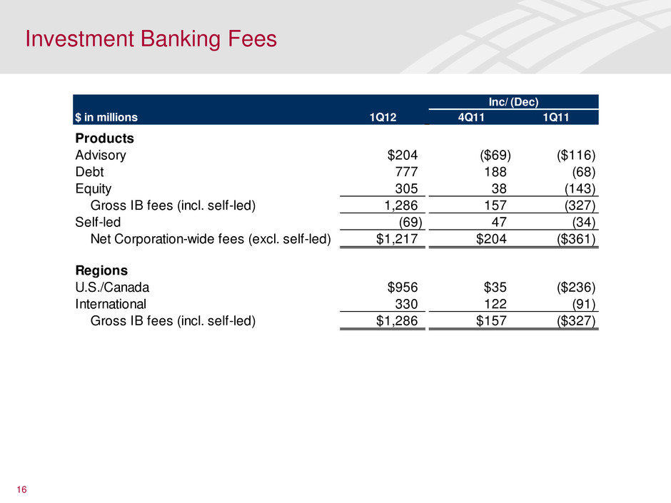 Investment Banking Fees $ in millions 1Q12 4Q11 1Q11 Products Advisory $204 ($69) ($116) Debt 777 188 (68) Equity 305 38 (143) Gross IB fees (incl. self-led) 1,286 157 (327) Self-led (69) 47 (34) Net Corporation-wide fees (excl. self-led) $1,217 $204 ($361) Regions U.S./Canada $956 $35 ($236) International 330 122 (91) Gross IB fees (incl. self-led) $1,286 $157 ($327) Inc/ (Dec) 16