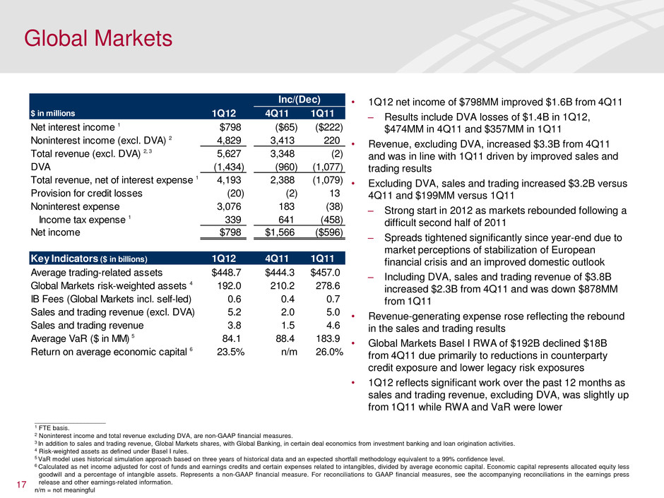 15 • Net income of $1.6B improved $253MM from 4Q11 • Revenue increased $448MM from 4Q11 – Corporation-wide investment banking fees increased $204MM from 4Q11 as increases in debt and equity underwriting fees were partially offset by slowdown in M&A activity 3 – Global Banking investment banking fees, including self-led, representing 54% of total IB fees, increased $23MM from 4Q11 – 1Q12 included equity investment gains and the impact of certain early buyout and sale transactions • Asset quality continued to improve from 4Q11 – Net charge-offs declined by $133MM, or 44% – Reservable criticized exposure declined by $2.1B, or 10% – Nonperforming assets fell $516MM, or 11% • Average loans grew modestly in commercial and industrial lending to our large corporate and commercial clients and were offset by declines in Commercial Real Estate, Dealer Financial Services and Trade Finance • Average deposit balances declined due to seasonal outflows and liquidity management actions • Bank of America Merrill Lynch ranked #2 globally in Net Investment Banking fees with a 6% market share in 1Q12 Global Banking $ in millions 1Q12 4Q11 1Q11 Net interest income 1 $2,399 $90 ($83) Noninterest income 2,052 358 (168) Total revenue, net of interest expense 1 4,451 448 (251) Provision for credit losses (238) 18 (115) Noninterest expense 2,178 41 (131) Income tax expense 1 921 136 (11) Net income $1,590 $253 $6 Key Indicators ($ in billions) 1Q12 4Q11 1Q11 Average loans and leases $277.1 $276.8 $256.8 Average deposits 237.5 240.7 225.8 IB Fees (Global Banking incl. self-led) 0.7 0.6 0.9 Business Lending revenue 2.0 1.9 2.2 Treasury Services revenue 1.6 1.5 1.5 Return on average economic capital 2 30.7% 25.1% 26.5% Net charge-off ratio 0.25% 0.45% 0.63% Reservable utilized crit. exp. $18.0 $20.1 $30.3 Nonperforming assets 4.1 4.6 6.8 Inc/(Dec) ____________________ 1 FTE basis. 2 Calculated as net income adjusted for cost of funds and earnings credit and certain expenses related to intangibles, divided by average economic capital. Economic capital represents allocated equity less goodwill and a percentage of intangible assets. Represents a non-GAAP financial measure. For reconciliations to GAAP financial measures, see the accompanying reconciliations in the earnings press release and other earnings-related information. 3 Global Banking and Global Markets share the economics of investment banking and underwriting activities performed by each segment.