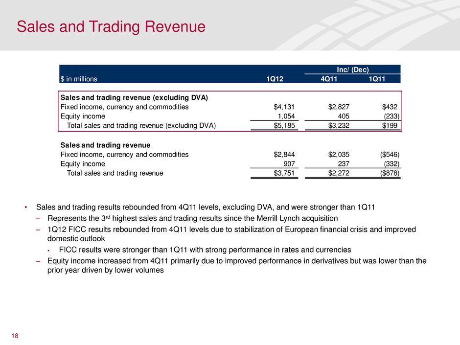 17 • 1Q12 net income of $798MM improved $1.6B from 4Q11 – Results include DVA losses of $1.4B in 1Q12, $474MM in 4Q11 and $357MM in 1Q11 • Revenue, excluding DVA, increased $3.3B from 4Q11 and was in line with 1Q11 driven by improved sales and trading results • Excluding DVA, sales and trading increased $3.2B versus 4Q11 and $199MM versus 1Q11 – Strong start in 2012 as markets rebounded following a difficult second half of 2011 – Spreads tightened significantly since year-end due to market perceptions of stabilization of European financial crisis and an improved domestic outlook – Including DVA, sales and trading revenue of $3.8B increased $2.3B from 4Q11 and was down $878MM from 1Q11 • Revenue-generating expense rose reflecting the rebound in the sales and trading results • Global Markets Basel I RWA of $192B declined $18B from 4Q11 due primarily to reductions in counterparty credit exposure and lower legacy risk exposures • 1Q12 reflects significant work over the past 12 months as sales and trading revenue, excluding DVA, was slightly up from 1Q11 while RWA and VaR were lower ____________________ 1 FTE basis. 2 Noninterest income and total revenue excluding DVA, are non-GAAP financial measures. 3 In addition to sales and trading revenue, Global Markets shares, with Global Banking, in certain deal economics from investment banking and loan origination activities. 4 Risk-weighted assets as defined under Basel I rules. 5 VaR model uses historical simulation approach based on three years of historical data and an expected shortfall methodology equivalent to a 99% confidence level. 6 Calculated as net income adjusted for cost of funds and earnings credits and certain expenses related to intangibles, divided by average economic capital. Economic capital represents allocated equity less goodwill and a percentage of intangible assets. Represents a non-GAAP financial measure. For reconciliations to GAAP financial measures, see the accompanying reconciliations in the earnings press release and other earnings-related information. n/m = not meaningful Global Markets $ in millions 1Q12 4Q11 1Q11 Net interest income 1 $798 ($65) ($222) Noninterest income (excl. DVA) 2 4,829 3,413 220 Total revenue (excl. DVA) 2, 3 5,627 3,348 (2) DVA (1,434) (960) (1,077) Total revenue, net of interest expense 1 4,193 2,388 (1,079) Provision for credit losses (20) (2) 13 Noninterest expense 3,076 183 (38) Income tax expense 1 339 641 (458) Net income $798 $1,566 ($596) Key Indicators ($ in billions) 1Q12 4Q11 1Q11 Average trading-related assets $448.7 $444.3 $457.0 Global Markets risk-weighted assets 4 192.0 210.2 278.6 IB Fees (Global Markets incl. self-led) 0.6 0.4 0.7 Sales and tradin revenue (excl. DVA) 5.2 2.0 5.0 Sales and trading revenu 3.8 1.5 4.6 Average VaR ($ in MM) 5 84.1 88.4 183.9 Return on average c nomic capital 6 23.5% n/m 26.0% Inc/(Dec)