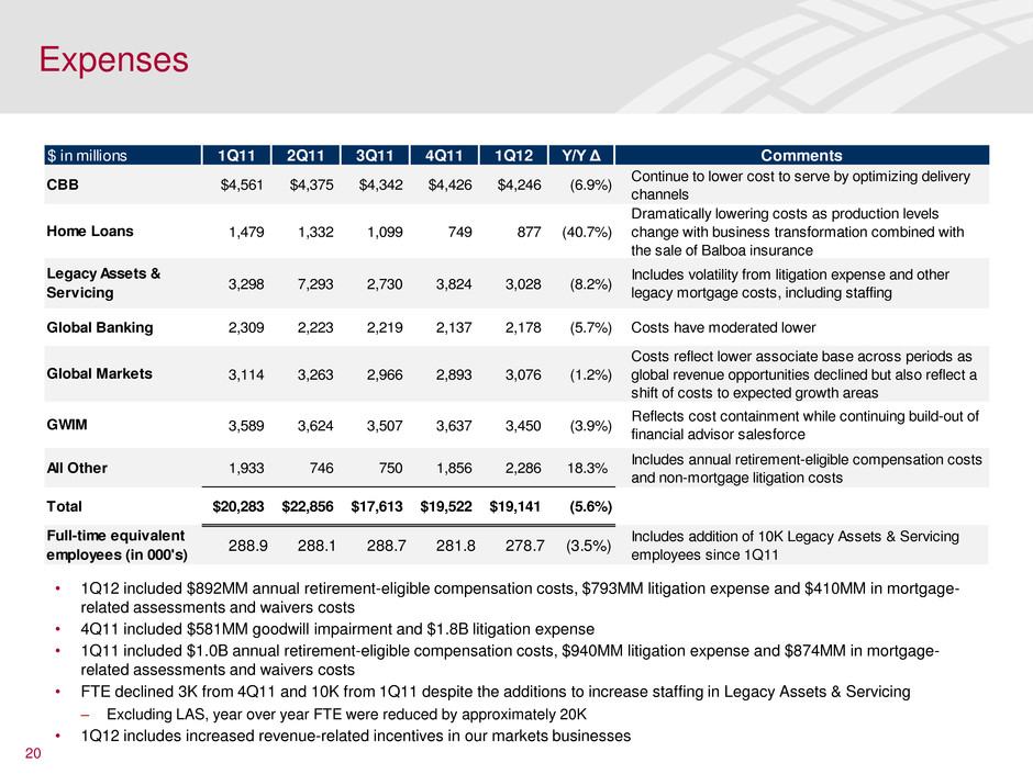 • Net loss of $2.6B declined $4.0B from 4Q11 driven by the $3.3B negative valuation adjustment on structured liabilities and lower equity gains • Revenue was impacted by the following selected items: • Noninterest expense increased from 4Q11 primarily due to the annual retirement-eligible compensation costs and higher non-mortgage litigation expense ____________________ 1 All Other consists of two broad groupings, Equity Investments and Other. Equity Investments includes Global Principal Investments, Strategic and other investments. Other includes liquidating businesses, merger and restructuring charges, ALM functions (i.e., residential mortgage portfolio and investment securities) and related activities (i.e., economic hedges, fair value option on structured liabilities), and the impact of certain allocation methodologies. Other also includes certain residential mortgage and discontinued real estate products that are managed by Legacy Assets & Servicing within CRES. 2 FTE basis. 19 All Other 1 $ in millions 1Q12 4Q11 1Q11 Total revenue, net of interest expense 2 ($613) ($4,903) ($2,711) Provision for credit losses 1,246 454 (919) Noninterest expense 2,286 430 353 Income tax benefit 2 (1,554) (1,832) (666) Net loss ($2,591) ($3,955) ($1,479) Key Indicators ($ in billions) 1Q12 4Q11 1Q11 Average loans and le ses $264.1 $272.8 $288.3 Average deposits 39.8 46.1 50.1 Book value of Global Principal Investments 4.7 5.6 11.2 Total BAC equity invest ent exposure 17.2 19.0 49.1 Inc/(Dec) $ in millions 1Q12 4Q11 1Q11 FVO on structured liabilities ($3,314) ($814) ($586) Equity investment income 417 3,110 1,415 Gains on sales of debt securities 712 1,102 468 Gains on debt and trust preferred repurchases 1,218 1,200 - Payment protection insurance provision (200) - -