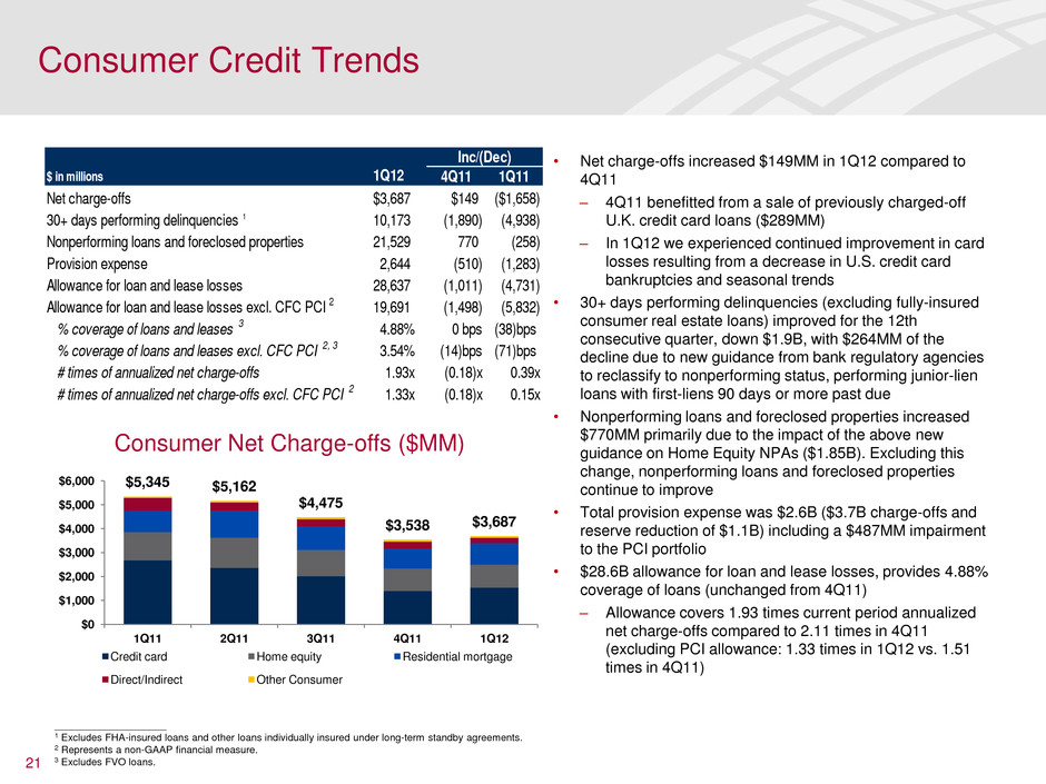$ in millions 1Q11 2Q11 3Q11 4Q11 1Q12 Y/Y Δ CBB $4,561 $4,375 $4,342 $4,426 $4,246 (6.9%) Continue to lower cost to serve by optimizing delivery channels Home Loans 1,479 1,332 1,099 749 877 (40.7%) Dramatically lowering costs as production levels change with business transformation combined with the sale of Balboa insurance Legacy Assets & Servicing 3,298 7,293 2,730 3,824 3,028 (8.2%) Includes volatility from litigation expense and other legacy mortgage costs, including staffing Global Banking 2,309 2,223 2,219 2,137 2,178 (5.7%) Costs have moderated lower Global Markets 3,114 3,263 2,966 2,893 3,076 (1.2%) Costs reflect lower associate base across periods as global revenue opportunities declined but also reflect a shift of costs to expected growth areas GWIM 3,589 3,624 3,507 3,637 3,450 (3.9%) Reflects cost containment while continuing build-out of financial advisor salesforce All Other 1,933 746 750 1,856 2,286 18.3% Includes annual retirement-eligible compensation costs and non-mortgage litigation costs Total $20,283 $22,856 $17,613 $19,522 $19,141 (5.6%) Full-time equivalent employees (in 000's) 288.9 288.1 288.7 281.8 278.7 (3.5%) Includes addition of 10K Legacy Assets & Servicing employees since 1Q11 Comments Expenses • 1Q12 included $892MM annual retirement-eligible compensation costs, $793MM litigation expense and $410MM in mortgage- related assessments and waivers costs • 4Q11 included $581MM goodwill impairment and $1.8B litigation expense • 1Q11 included $1.0B annual retirement-eligible compensation costs, $940MM litigation expense and $874MM in mortgage- related assessments and waivers costs • FTE declined 3K from 4Q11 and 10K from 1Q11 despite the additions to increase staffing in Legacy Assets & Servicing – Excluding LAS, year over year FTE were reduced by approximately 20K • 1Q12 includes increased revenue-related incentives in our markets businesses 20