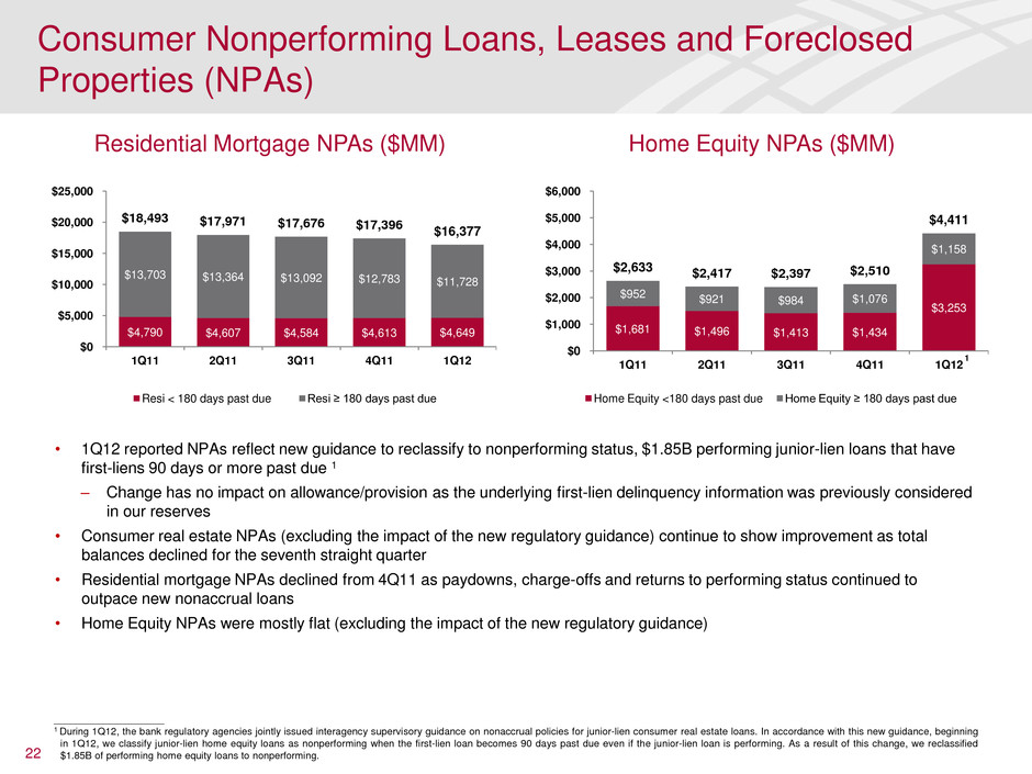 • Net charge-offs increased $149MM in 1Q12 compared to 4Q11 – 4Q11 benefitted from a sale of previously charged-off U.K. credit card loans ($289MM) – In 1Q12 we experienced continued improvement in card losses resulting from a decrease in U.S. credit card bankruptcies and seasonal trends • 30+ days performing delinquencies (excluding fully-insured consumer real estate loans) improved for the 12th consecutive quarter, down $1.9B, with $264MM of the decline due to new guidance from bank regulatory agencies to reclassify to nonperforming status, performing junior-lien loans with first-liens 90 days or more past due • Nonperforming loans and foreclosed properties increased $770MM primarily due to the impact of the above new guidance on Home Equity NPAs ($1.85B). Excluding this change, nonperforming loans and foreclosed properties continue to improve • Total provision expense was $2.6B ($3.7B charge-offs and reserve reduction of $1.1B) including a $487MM impairment to the PCI portfolio • $28.6B allowance for loan and lease losses, provides 4.88% coverage of loans (unchanged from 4Q11) – Allowance covers 1.93 times current period annualized net charge-offs compared to 2.11 times in 4Q11 (excluding PCI allowance: 1.33 times in 1Q12 vs. 1.51 times in 4Q11) 21 ____________________ 1 Excludes FHA-insured loans and other loans individually insured under long-term standby agreements. 2 Represents a non-GAAP financial measure. 3 Excludes FVO loans. Consumer Credit Trends $ in millions 4Q11 1Q11 Net charge-offs $3,687 $149 ($1,658) 30+ days performing delinquencies 1 10,173 (1,890) (4,938) Nonperforming loans and foreclosed properties 21,529 770 (258) Provision expense 2,644 (510) (1,283) Allowance for loan and lease losses 28,637 (1,011) (4,731) Allowance for loan and lease losses excl. CFC PCI 2 19,691 (1,498) (5,832) % coverage of loans and leases 3 4.88% 0 bps (38)bps % coverage of loans and leases excl. CFC PCI 2, 3 3.54% (14)bps (71)bps # times of annualized net charge-offs 1.93x (0.18)x 0.39x # times of annua ized n t charge-offs excl. CFC PCI 2 1.33x (0.18)x 0.15x 1Q12 Inc/(Dec) Consumer Net Charge-offs ($MM) $5,345 $5,162 $4,475 $3,538 $3,687 $0 $1,000 $2,000 $3,000 $4,000 $5,000 $6,000 1Q11 2Q11 3Q11 4Q11 1Q12 Credit card Home equity Residential mortgage Direct/Indirect Other Consumer