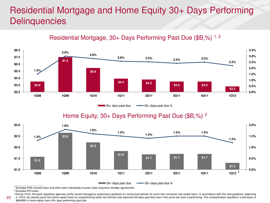 22 Residential Mortgage NPAs ($MM) Home Equity NPAs ($MM) Consumer Nonperforming Loans, Leases and Foreclosed Properties (NPAs) $4,790 $4,607 $4,584 $4,613 $4,649 $13,703 $13,364 $13,092 $12,783 $11,728 $18,493 $17,971 $17,676 $17,396 $16,377 $0 $5,000 $10,000 $15,000 $20,000 $25,000 1Q11 2Q11 3Q11 4Q11 1Q12 Resi < 180 days past due Resi ≥ 180 days past due $1,681 $1,496 $1,413 $1,434 $3,253 $952 $921 $984 $1,076 $1,158 $2,633 $2,417 $2,397 $2,510 $4,411 $0 $1,000 $2,000 $3,000 $4,000 $5,000 $6,000 1Q11 2Q11 3Q11 4Q11 1Q12 Home Equity <180 days past due Home Equity ≥ 180 days past due • 1Q12 reported NPAs reflect new guidance to reclassify to nonperforming status, $1.85B performing junior-lien loans that have first-liens 90 days or more past due 1 – Change has no impact on allowance/provision as the underlying first-lien delinquency information was previously considered in our reserves • Consumer real estate NPAs (excluding the impact of the new regulatory guidance) continue to show improvement as total balances declined for the seventh straight quarter • Residential mortgage NPAs declined from 4Q11 as paydowns, charge-offs and returns to performing status continued to outpace new nonaccrual loans • Home Equity NPAs were mostly flat (excluding the impact of the new regulatory guidance) ____________________ 1 During 1Q12, the bank regulatory agencies jointly issued interagency supervisory guidance on nonaccrual policies for junior-lien consumer real estate loans. In accordance with this new guidance, beginning in 1Q12, we classify junior-lien home equity loans as nonperforming when the first-lien loan becomes 90 days past due even if the junior-lien loan is performing. As a result of this change, we reclassified $1.85B of performing home equity loans to nonperforming. 1