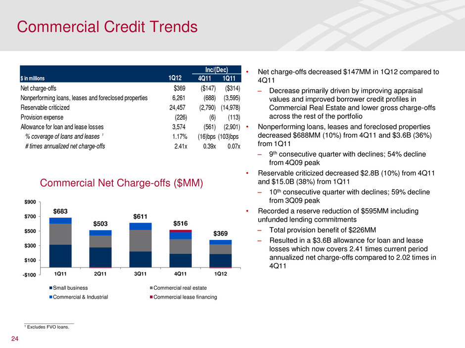23 ____________________ 1 Excludes FHA-insured loans and other loans individually insured under long-term standby agreements. 2 Excludes PCI loans. 3 During 1Q12, the bank regulatory agencies jointly issued interagency supervisory guidance on nonaccrual policies for junior-lien consumer real estate loans. In accordance with this new guidance, beginning in 1Q12, we classify junior-lien home equity loans as nonperforming when the first-lien loan becomes 90 days past due even if the junior-lien loan is performing. The reclassification resulted in a decrease of $264MM in home equity loans 30+ days performing past due. Residential Mortgage, 30+ Days Performing Past Due ($B,%) 1, 2 Home Equity, 30+ Days Performing Past Due ($B,%) 2 Residential Mortgage and Home Equity 30+ Days Performing Delinquencies $4.0 $7.5 $5.9 $4.4 $4.3 $4.0 $4.0 $3.3 1.5% 3.0% 2.8% 2.6% 2.5% 2.4% 2.5% 2.2% 0.0% 0.5% 1.0% 1.5% 2.0% 2.5% 3.0% 3.5% $2.5 $3.5 $4.5 $5.5 $6.5 $7.5 $8.5 1Q08 1Q09 1Q10 1Q11 2Q11 3Q11 4Q11 1Q12 30+ days past due 30+ days past due % $1.6 $2.6 $2.2 $1.8 $1.7 $1.7 $1.7 $1.3 1.3% 1.8% 1.6% 1.5% 1.4% 1.5% 1.5% 1.2% 0.0% 0.5% 1.0% 1.5% 2.0% $1.0 $1.5 $2.0 $2.5 $3.0 1Q08 1Q09 1Q10 1Q11 2Q11 3Q11 4Q11 1Q12 30+ days past due 30+ days past due % 3