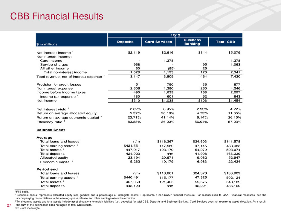 ____________________ 1 FTE basis. FTE basis for the Total Corporation and pre-tax, pre-provision are non-GAAP financial measures. 2 For reconciliations to GAAP financial measures, see the accompanying reconciliations in the earnings press release and other earnings-related information. 26 1Q12 Results by Business Segment $ in millions Total Corporation CBB CRES GWIM Global Banking Global Markets All Other Net interest income 1, 2 $11,053 $5,079 $775 $1,578 $2,399 $798 $424 Card income 1,457 1,278 - 3 89 - 87 Service charges 1,912 1,063 - 24 809 13 3 Investment and brokerage services 2,876 46 - 2,296 34 510 (10) Investment banking income (loss) 1,217 2 - 76 652 556 (69) Equity investment income 765 25 - 13 13 297 417 Trading account profits (losses) 2,075 (1) - 41 (15) 2,038 12 Mortgage banking income (loss) 1,612 - 1,831 8 - 13 (240) Insurance income (loss) (60) 27 6 79 1 - (173) Gains on sales of debt securities 752 - 2 - 2 36 712 All other income (loss) (1,174) (99) 60 242 467 (68) (1,776) Total noninterest income 11,432 2,341 1,899 2,782 2,052 3,395 (1,037) Total revenue, net of interest expense 1, 2 22,485 7,420 2,674 4,360 4,451 4,193 (613) Total noninterest expense 19,141 4,246 3,905 3,450 2,178 3,076 2,286 Pre-tax, pre-provision earnings (loss) 1 3,344 3,174 (1,231) 910 2,273 1,117 (2,899) Provision for credit losses 2,418 877 507 46 (238) (20) 1,246 Income (loss) before income taxes 926 2,297 (1,738) 864 2,511 1,137 (4,145) Income tax expense (benefit) 1, 2 273 843 (593) 317 921 339 (1,554) Net income (loss) $653 $1,454 ($1,145) $547 $1,590 $798 ($2,591)
