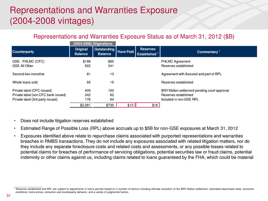 1Q11 2Q11 3Q11 4Q11 1Q12 GSEs $5,350 $5,081 $4,721 $6,258 $8,103 Monolines 4,979 3,052 3,058 3,082 3,136 Private 1,567 1,782 2,229 3,267 4,855 Total $11,896 $9,915 $10,008 $12,607 $16,094 • Total representations and warranties provision was $282MM in 1Q12, which included the impact of higher estimated repurchase claims related to the GSEs combined with increased experience with a monoline insurer, compared to $1.0B in 1Q11 • Estimated range of possible loss related to non-GSE representations and warranties exposure remains unchanged and could be up to $5B over existing accruals at March 31, 2012. The company is not currently able to reasonably estimate the possible loss or range of possible loss with respect to GSE representations and warranties exposure over existing accruals at March 31, 2012 • Increase in private-label new claims is primarily related to repurchase requests received from trustees on private-label securitization transactions not included in the BNY Mellon settlement • The GSEs’ repurchase requests, standards for rescission of repurchase requests and resolution processes continue to be inconsistent with the GSEs’ own past conduct and our interpretation of our contractual obligations. These developments have resulted in an increase in claims outstanding from the GSEs. We intend to repurchase loans to the extent required under the contracts and standards that govern our relationships with the GSEs • In addition to the claims in these tables, we have received repurchase demands from private-label securitization investors and a master servicer where we believe the claimant has not satisfied the contractual thresholds to direct the securitization trustee to take action and/or that these demands are otherwise procedurally or substantively invalid. The amounts outstanding of total demands were $3.1B as of March 31, 2012 and $1.7B as of December 31, 2011, September 30, 2011, June 30, 2011 and March 31, 2011. $1.7B of these demands relate to loans underlying securitizations included in the settlement with BNY Mellon, as trustee. A claimant has filed litigation against us relating to $1.4B of such demands. If the BNY Mellon settlement is approved by the court, demands related to loans underlying securitizations included in the settlement with BNY Mellon, as trustee will be resolved by the settlement 30 Liability for Representations and Warranties ($MM) Outstanding Claims by Counterparty ($MM) New Claim Trends ($MM) Representations and Warranties 1Q1 2Q11 3Q11 4Q11 1Q12 Beginning Balance $5,438 $6,220 $17,780 $16,271 $15,858 Additions for new sales 7 3 3 7 5 Provision 1,013 14,037 278 26 282 Charge-offs (238) (2,480) (1,790) (68 ) (399) Ending Balance $6,220 $17,780 $16,271 $15,858 $15,746 1Q11 2Q11 3Q11 4Q11 1Q12 Mix 1 Pre 2005 $132 $214 $95 $77 $86 3% 2005 412 441 668 751 516 14% 2006 1,609 780 925 1,400 2,302 31% 2007 2,277 1,784 1,493 2,168 1,382 40% 2008 488 398 451 331 264 8% Post 2008 144 162 164 126 193 4% New Claims $5,062 $3,779 $3,796 $4,853 $4,743 % GSEs 86% 89% 86% 68% 63% Rescinded claims $950 $3,822 $1,499 $1,229 $773 Approved repurchas 1,134 2,028 2,255 1,170 480 Outstanding claims 11,896 9,915 10,008 12,607 16,094 % GSEs 45% 51% 47% 50% 50% ____________________ 1 Mix for new claims trend is calculated based on last four quarters.