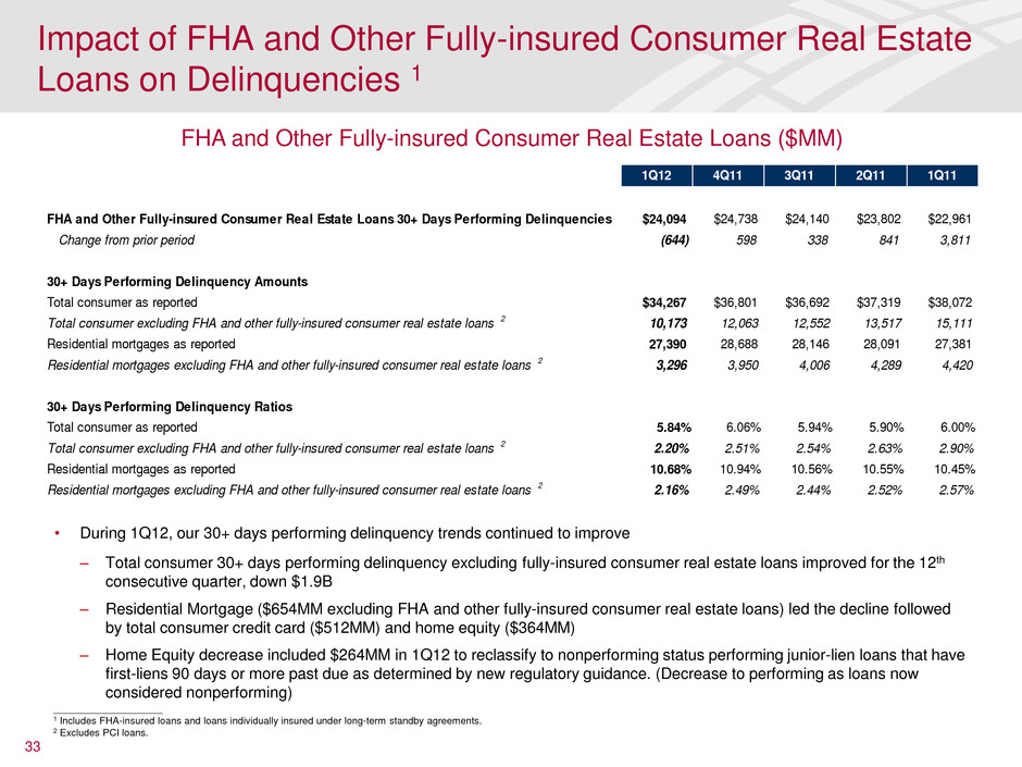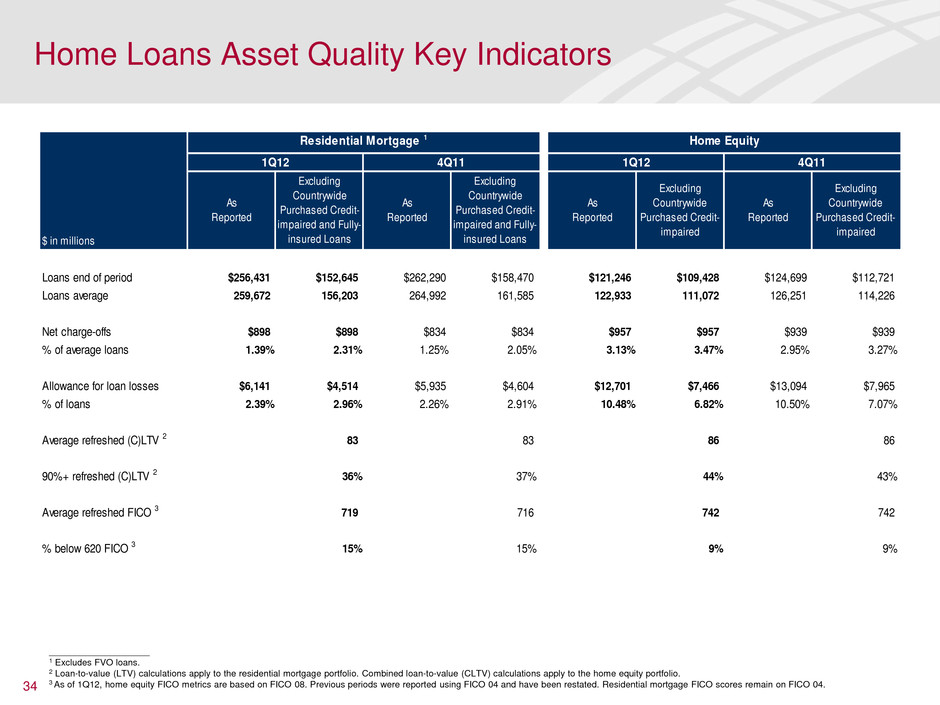 33 ____________________ 1 Includes FHA-insured loans and loans individually insured under long-term standby agreements. 2 Excludes PCI loans. FHA and Other Fully-insured Consumer Real Estate Loans ($MM) • During 1Q12, our 30+ days performing delinquency trends continued to improve – Total consumer 30+ days performing delinquency excluding fully-insured consumer real estate loans improved for the 12th consecutive quarter, down $1.9B – Residential Mortgage ($654MM excluding FHA and other fully-insured consumer real estate loans) led the decline followed by total consumer credit card ($512MM) and home equity ($364MM) – Home Equity decrease included $264MM in 1Q12 to reclassify to nonperforming status performing junior-lien loans that have first-liens 90 days or more past due as determined by new regulatory guidance. (Decrease to performing as loans now considered nonperforming) Impact of FHA and Other Fully-insured Consumer Real Estate Loans on Delinquencies 1 1Q12 4Q11 3Q11 2Q11 1Q11 FHA and Other Fully-insured Consumer Real Estate Loans 30+ Days Performing Delinquencies $24,094 $24,738 $24,140 $23,802 $22,961 Change from prior period (644) 598 338 841 3,811 30+ Days Performing Delinquency Amounts Total consumer as reported $34,267 $36,801 $36,692 $37,319 $38,072 Total consumer excluding FHA and other fully-insured consumer real estate loans 2 10,173 12,063 12,552 13,517 15,111 Residential mortgages as reported 27,390 28,688 28,146 28,091 27,381 Residential mortgages excluding FHA and other fully-insured consumer real estate loans 2 3,296 3,950 4,006 4,289 4,420 30+ Days Performing Delinquency Ratios Total consumer as reported 5.84% 6.06% 5.94% 5.90% 6.00% Total consumer excluding FHA and other fully-insured consumer real estate loans 2 2.20% 2.51% 2.54% 2.63% 2.90% Residential mortgages as reported 10.68% 10.94% 10.56% 10.55% 10.45% Residential mortgages excluding FHA and other fully-insured consumer real estate loans 2 2.16% 2.49% 2.44% 2.52% 2.57%