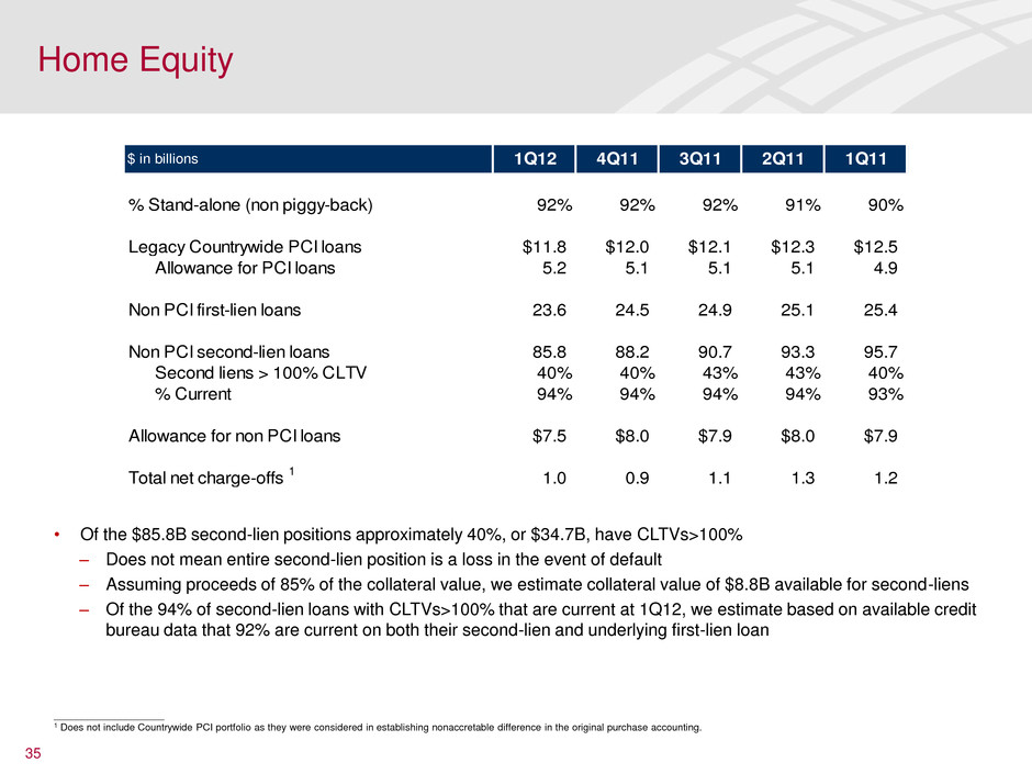 34 ____________________ 1 Excludes FVO loans. 2 Loan-to-value (LTV) calculations apply to the residential mortgage portfolio. Combined loan-to-value (CLTV) calculations apply to the home equity portfolio. 3 As of 1Q12, home equity FICO metrics are based on FICO 08. Previous periods were reported using FICO 04 and have been restated. Residential mortgage FICO scores remain on FICO 04. Home Loans Asset Quality Key Indicators As Reported Excluding Countrywide Purchased Credit- impaired and Fully- insured Loans As Reported Excluding Countrywide Purchased Credit- impaired and Fully- insured Loans As Reported Excluding Countrywide Purchased Credit- impaired As Reported Excluding Countrywide Purchased Credit- impaired Loans end of period $256,431 $152,645 $262,290 $158,470 $121,246 $109,428 $124,699 $112,721 Loans average 259,672 156,203 264,992 161,585 122,933 111,072 126,251 114,226 Net charge-offs $898 $898 $834 $834 $957 $957 $939 $939 % of average loans 1.39% 2.31% 1.25% 2.05% 3.13% 3.47% 2.95% 3.27% Allowance for loan losses $6,141 $4,514 $5,935 $4,604 $12,701 $7,466 $13,094 $7,965 % of loans 2.39% 2.96% 2.26% 2.91% 10.48% 6.82% 10.50% 7.07% Average refreshed (C)LTV 2 83 83 86 86 90%+ refreshed (C)LTV 2 36% 37% 44% 43% Average refreshed FICO 3 719 716 742 742 % below 620 FICO 3 15% 15% 9% 9% $ in millions Residential Mortgage 1 Home Equity 1Q12 4Q11 1Q12 4Q11