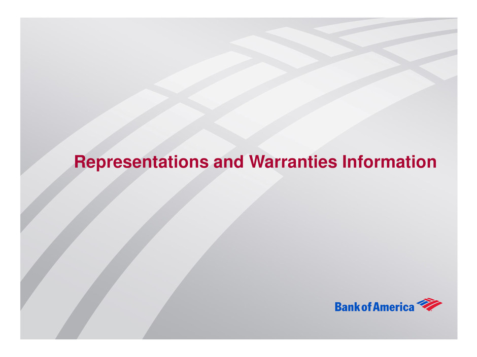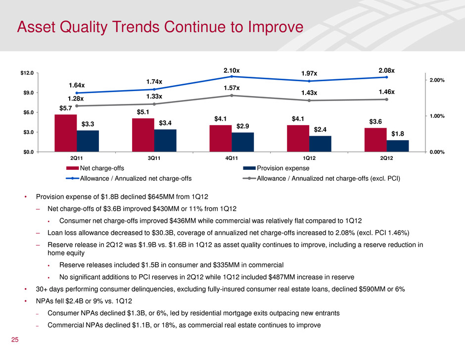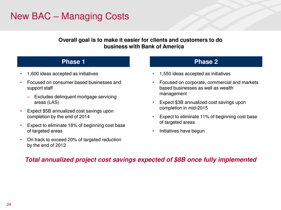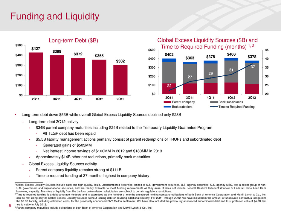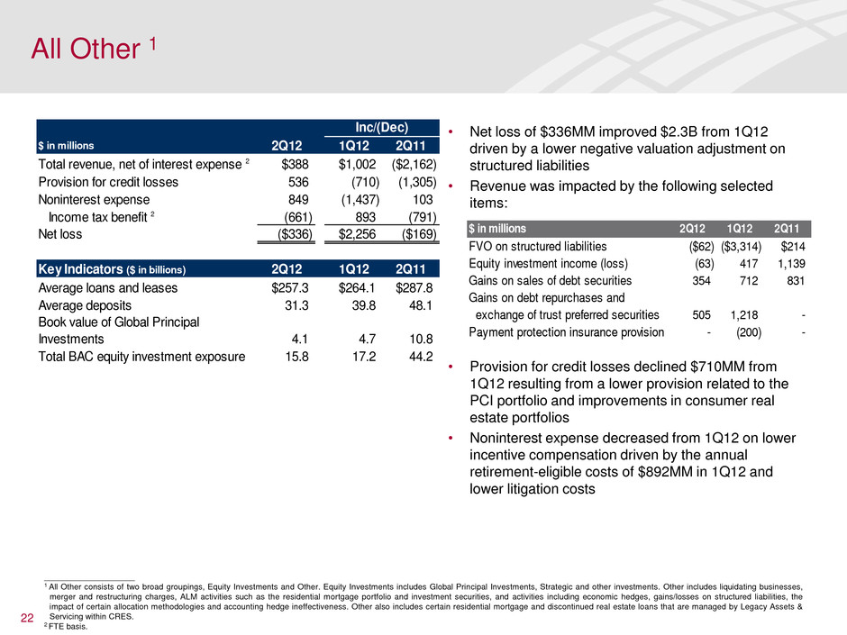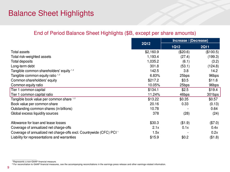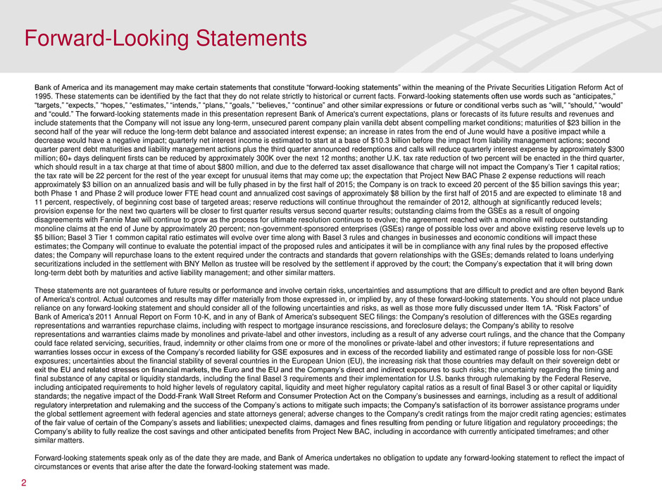 Bank of America and its management may make certain statements that constitute “forward-looking statements” within the meaning of the Private Securities Litigation Reform Act of 1995. These statements can be identified by the fact that they do not relate strictly to historical or current facts. Forward-looking statements often use words such as “anticipates,” “targets,” “expects,” “hopes,” “estimates,” “intends,” “plans,” “goals,” “believes,” “continue” and other similar expressions or future or conditional verbs such as “will,” “should,” “would” and “could.” The forward-looking statements made in this presentation represent Bank of America's current expectations, plans or forecasts of its future results and revenues and include statements that the Company will not issue any long-term, unsecured parent company plain vanilla debt absent compelling market conditions; maturities of $23 billion in the second half of the year will reduce the long-term debt balance and associated interest expense; an increase in rates from the end of June would have a positive impact while a decrease would have a negative impact; quarterly net interest income is estimated to start at a base of $10.3 billion before the impact from liability management actions; second quarter parent debt maturities and liability management actions plus the third quarter announced redemptions and calls will reduce quarterly interest expense by approximately $300 million; 60+ days delinquent firsts can be reduced by approximately 300K over the next 12 months; another U.K. tax rate reduction of two percent will be enacted in the third quarter, which should result in a tax charge at that time of about $800 million, and due to the deferred tax asset disallowance that charge will not impact the Company’s Tier 1 capital ratios; the tax rate will be 22 percent for the rest of the year except for unusual items that may come up; the expectation that Project New BAC Phase 2 expense reductions will reach approximately $3 billion on an annualized basis and will be fully phased in by the first half of 2015; the Company is on track to exceed 20 percent of the $5 billion savings this year; both Phase 1 and Phase 2 will produce lower FTE head count and annualized cost savings of approximately $8 billion by the first half of 2015 and are expected to eliminate 18 and 11 percent, respectively, of beginning cost base of targeted areas; reserve reductions will continue throughout the remainder of 2012, although at significantly reduced levels; provision expense for the next two quarters will be closer to first quarter results versus second quarter results; outstanding claims from the GSEs as a result of ongoing disagreements with Fannie Mae will continue to grow as the process for ultimate resolution continues to evolve; the agreement reached with a monoline will reduce outstanding monoline claims at the end of June by approximately 20 percent; non-government-sponsored enterprises (GSEs) range of possible loss over and above existing reserve levels up to $5 billion; Basel 3 Tier 1 common capital ratio estimates will evolve over time along with Basel 3 rules and changes in businesses and economic conditions will impact these estimates; the Company will continue to evaluate the potential impact of the proposed rules and anticipates it will be in compliance with any final rules by the proposed effective dates; the Company will repurchase loans to the extent required under the contracts and standards that govern relationships with the GSEs; demands related to loans underlying securitizations included in the settlement with BNY Mellon as trustee will be resolved by the settlement if approved by the court; the Company’s expectation that it will bring down long-term debt both by maturities and active liability management; and other similar matters. These statements are not guarantees of future results or performance and involve certain risks, uncertainties and assumptions that are difficult to predict and are often beyond Bank of America's control. Actual outcomes and results may differ materially from those expressed in, or implied by, any of these forward-looking statements. You should not place undue reliance on any forward-looking statement and should consider all of the following uncertainties and risks, as well as those more fully discussed under Item 1A. “Risk Factors” of Bank of America's 2011 Annual Report on Form 10-K, and in any of Bank of America's subsequent SEC filings: the Company's resolution of differences with the GSEs regarding representations and warranties repurchase claims, including with respect to mortgage insurance rescissions, and foreclosure delays; the Company's ability to resolve representations and warranties claims made by monolines and private-label and other investors, including as a result of any adverse court rulings, and the chance that the Company could face related servicing, securities, fraud, indemnity or other claims from one or more of the monolines or private-label and other investors; if future representations and warranties losses occur in excess of the Company’s recorded liability for GSE exposures and in excess of the recorded liability and estimated range of possible loss for non-GSE exposures; uncertainties about the financial stability of several countries in the European Union (EU), the increasing risk that those countries may default on their sovereign debt or exit the EU and related stresses on financial markets, the Euro and the EU and the Company’s direct and indirect exposures to such risks; the uncertainty regarding the timing and final substance of any capital or liquidity standards, including the final Basel 3 requirements and their implementation for U.S. banks through rulemaking by the Federal Reserve, including anticipated requirements to hold higher levels of regulatory capital, liquidity and meet higher regulatory capital r