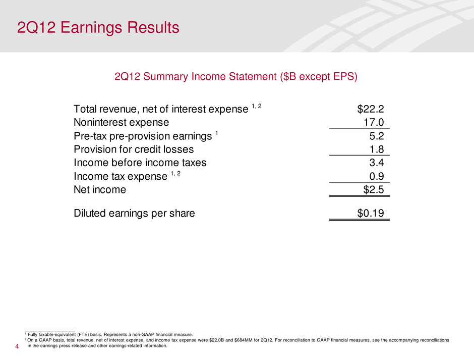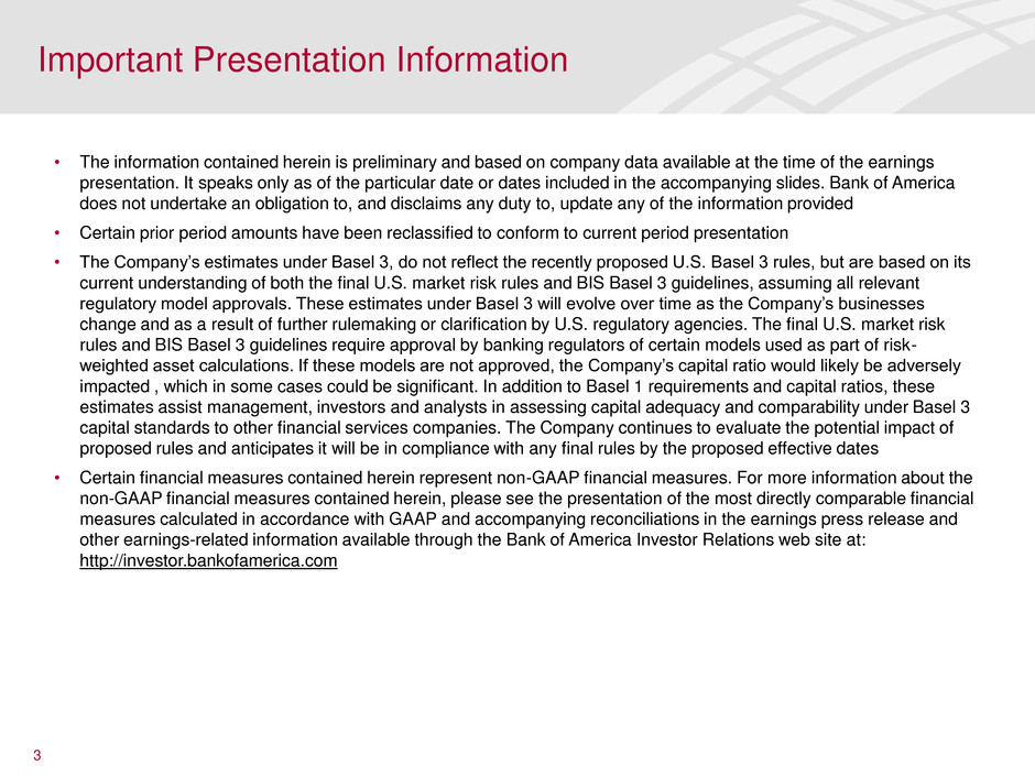 • The information contained herein is preliminary and based on company data available at the time of the earnings presentation. It speaks only as of the particular date or dates included in the accompanying slides. Bank of America does not undertake an obligation to, and disclaims any duty to, update any of the information provided • Certain prior period amounts have been reclassified to conform to current period presentation • The Company’s estimates under Basel 3, do not reflect the recently proposed U.S. Basel 3 rules, but are based on its current understanding of both the final U.S. market risk rules and BIS Basel 3 guidelines, assuming all relevant regulatory model approvals. These estimates under Basel 3 will evolve over time as the Company’s businesses change and as a result of further rulemaking or clarification by U.S. regulatory agencies. The final U.S. market risk rules and BIS Basel 3 guidelines require approval by banking regulators of certain models used as part of risk- weighted asset calculations. If these models are not approved, the Company’s capital ratio would likely be adversely impacted , which in some cases could be significant. In addition to Basel 1 requirements and capital ratios, these estimates assist management, investors and analysts in assessing capital adequacy and comparability under Basel 3 capital standards to other financial services companies. The Company continues to evaluate the potential impact of proposed rules and anticipates it will be in compliance with any final rules by the proposed effective dates • Certain financial measures contained herein represent non-GAAP financial measures. For more information about the non-GAAP financial measures contained herein, please see the presentation of the most directly comparable financial measures calculated in accordance with GAAP and accompanying reconciliations in the earnings press release and other earnings-related information available through the Bank of America Investor Relations web site at: http://investor.bankofamerica.com 3 Important Presentation Information