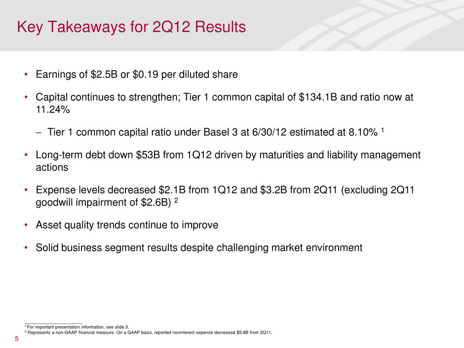 2Q12 Earnings Results 4 2Q12 Summary Income Statement ($B except EPS) ____________________ 1 Fully taxable-equivalent (FTE) basis. Represents a non-GAAP financial measure. 2 On a GAAP basis, total revenue, net of interest expense, and income tax expense were $22.0B and $684MM for 2Q12. For reconciliation to GAAP financial measures, see the accompanying reconciliations in the earnings press release and other earnings-related information. Total revenue, net of interest expense 1, 2 $22.2 Noninterest expense 17.0 Pre-tax pre-provision earnings 1 5.2 Provision for credit losses 1.8 Income before income taxes 3.4 Income tax expense 1, 2 0.9 Net income $2.5 Diluted earnings per share $0.19