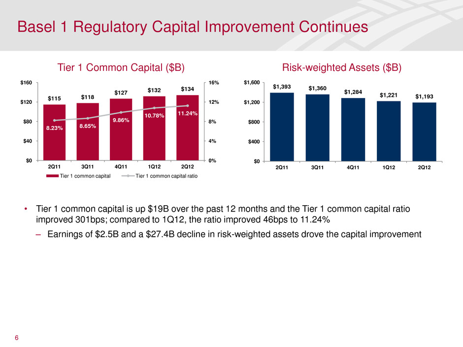 Key Takeaways for 2Q12 Results • Earnings of $2.5B or $0.19 per diluted share • Capital continues to strengthen; Tier 1 common capital of $134.1B and ratio now at 11.24% – Tier 1 common capital ratio under Basel 3 at 6/30/12 estimated at 8.10% 1 • Long-term debt down $53B from 1Q12 driven by maturities and liability management actions • Expense levels decreased $2.1B from 1Q12 and $3.2B from 2Q11 (excluding 2Q11 goodwill impairment of $2.6B) 2 • Asset quality trends continue to improve • Solid business segment results despite challenging market environment 5 ____________________ 1 For important presentation information, see slide 3. 2 Represents a non-GAAP financial measure. On a GAAP basis, reported noninterest expense decreased $5.8B from 2Q11.