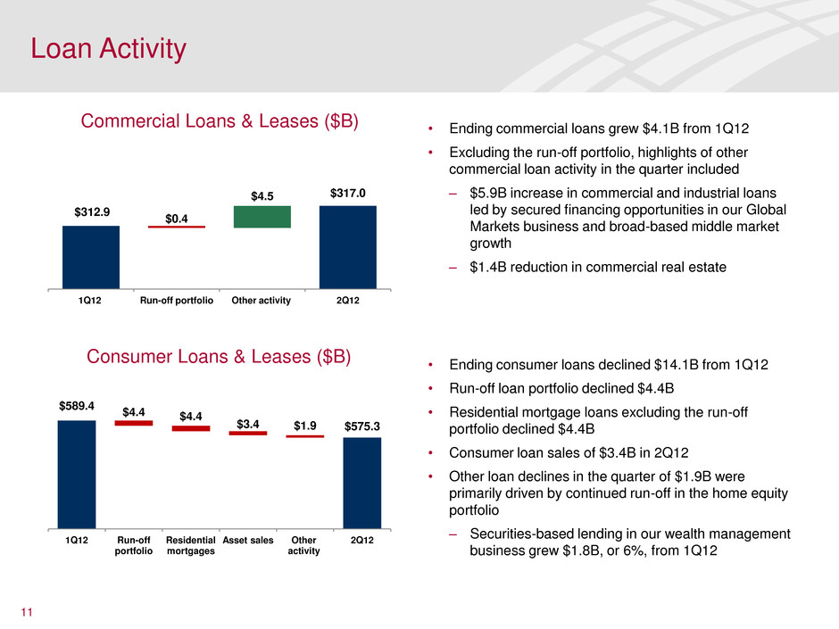 • Net interest income and net interest yield decreased $1.3B and 30bps from 1Q12 primarily due to unfavorable market- related impacts of higher premium amortization on securities and hedge ineffectiveness • Excluding these impacts, net interest income and net interest yield decreased $0.4B and 10bps from 1Q12 – Total loans and leases net interest income declined $0.4B which includes continued reductions from run-off portfolios – Trading net interest income declined $0.1B – Partially offsetting these declines is a benefit of $0.2B from reductions in long-term debt including liability management actions • Near term outlook for net interest income includes benefits from liability management actions – Given 2Q12 parent company maturities and liability actions plus the 3Q12 announced redemptions and calls, quarterly net interest income to benefit by approximately $300MM ($60MM recognized in 2Q12) 10 1Q12 Net Interest Income ($B) 1 $10.7 $11.1 $0.2 $0.2 $0 $2 $4 $6 $8 $10 $12 1Q12 adjusted NII Market-related premium amortization Market-related hedge ineffectiveness 1Q12 reported NII $10.3 $9.8 $0.3 $0.2 $0 $2 $4 $6 $8 $10 $12 2Q12 adjusted NII Market-related premium amortization Market-related hedge ineffectiveness 2Q12 reported NII 2Q12 Net Interest Income ($B) 1 NIY 2.42% 0.06% 0.03% 2.51%NIY 2.32% (0.07%) (0. 4%) 2.21% Net Interest Income ____________________ 1 FTE basis. On a GAAP basis, reported net interest income was $9.5B and $10.8B for 2Q12 and 1Q12. For reconciliation to GAAP financial measures, see the accompanying reconciliations in the earnings press release and other earnings-related information. 2 Represents a non-GAAP financial measure. 2 2