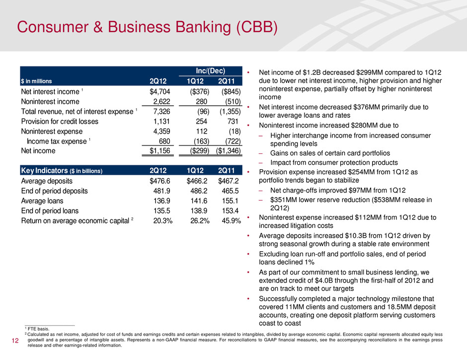 12 • Net income of $1.2B decreased $299MM compared to 1Q12 due to lower net interest income, higher provision and higher noninterest expense, partially offset by higher noninterest income • Net interest income decreased $376MM primarily due to lower average loans and rates • Noninterest income increased $280MM due to – Higher interchange income from increased consumer spending levels – Gains on sales of certain card portfolios – Impact from consumer protection products • Provision expense increased $254MM from 1Q12 as portfolio trends began to stabilize – Net charge-offs improved $97MM from 1Q12 – $351MM lower reserve reduction ($538MM release in 2Q12) • Noninterest expense increased $112MM from 1Q12 due to increased litigation costs • Average deposits increased $10.3B from 1Q12 driven by strong seasonal growth during a stable rate environment • Excluding loan run-off and portfolio sales, end of period loans declined 1% • As part of our commitment to small business lending, we extended credit of $4.0B through the first-half of 2012 and are on track to meet our targets • Successfully completed a major technology milestone that covered 11MM clients and customers and 18.5MM deposit accounts, creating one deposit platform serving customers coast to coast Consumer & Business Banking (CBB) $ in millions 2Q12 1Q12 2Q11 Net interest income 1 $4,704 ($376) ($845) Noninterest income 2,622 280 (510) Total revenue, net of interest expense 1 7,326 (96) (1,355) Provision for credit losses 1,131 254 731 Noninterest expense 4,359 112 (18) Income tax expense 1 680 (163) (722) Net income $1,156 ($299) ($1,346) Key Indicators ($ in billions) 2Q12 1Q12 2Q11 Average deposits $476.6 $466.2 $467.2 End of period deposit 481.9 486.2 465.5 Average loans 136.9 141.6 155.1 End of period loans 135.5 138.9 153.4 Return on average econ mic capital 2 20.3% 26.2% 45.9% Inc/(Dec) ____________________ 1 FTE basis. 2 Calculated as net income, adjusted for cost of funds and earnings credits and certain expenses related to intangibles, divided by average economic capital. Economic capital represents allocated equity less goodwill and a percentage of intangible assets. Represents a non-GAAP financial measure. For reconciliations to GAAP financial measures, see the accompanying reconciliations in the earnings press release and other earnings-related information.