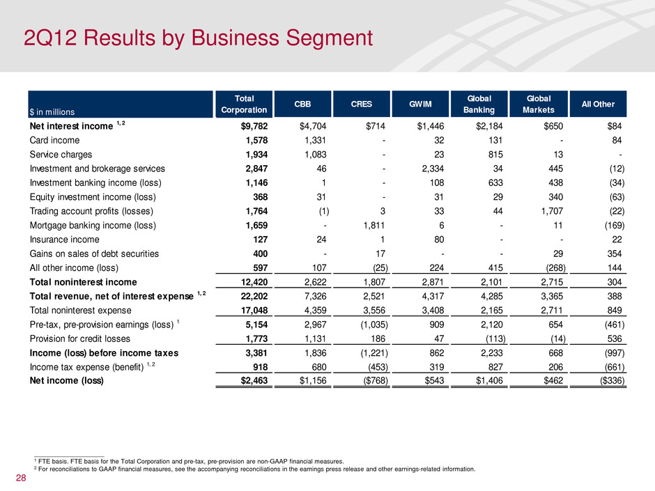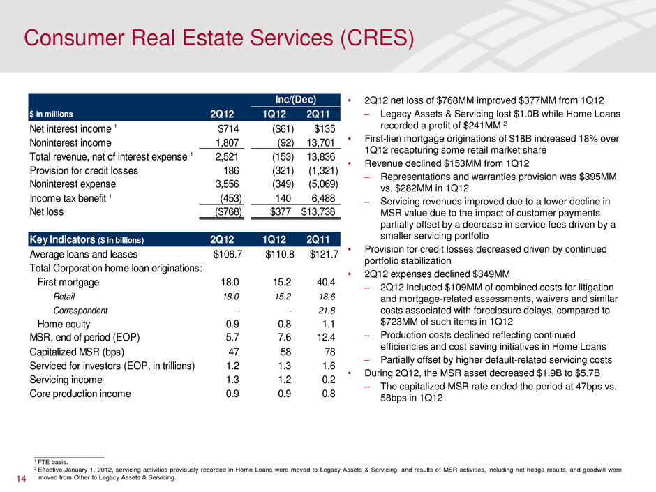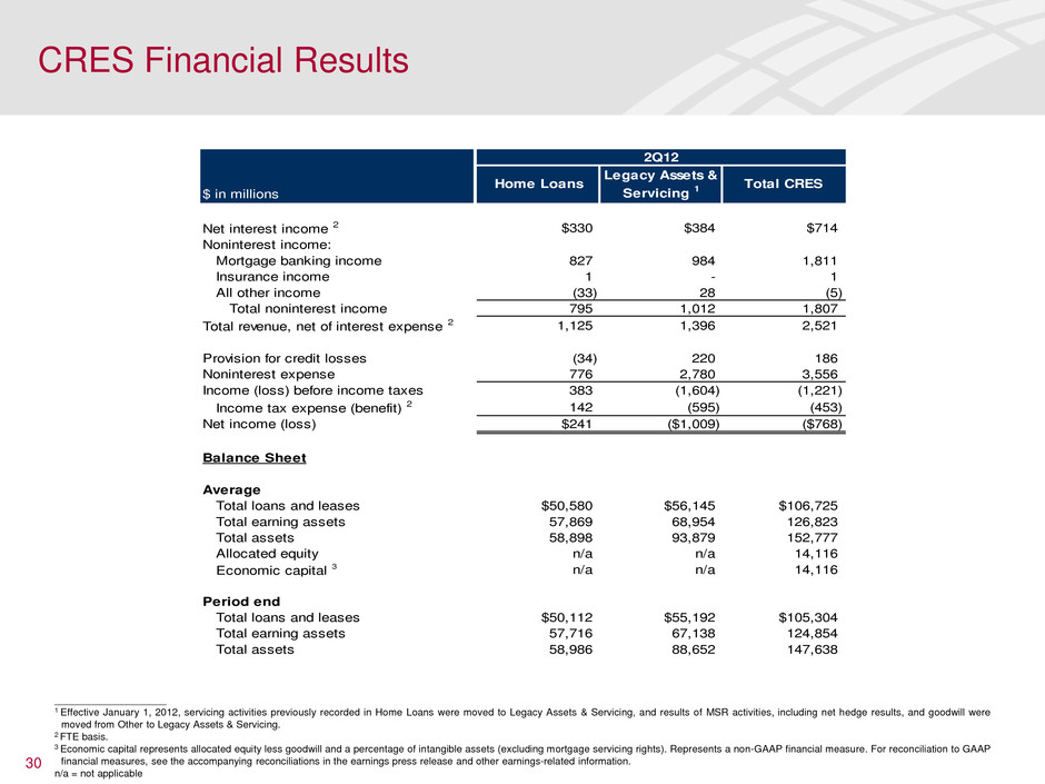 30 ____________________ 1 Effective January 1, 2012, servicing activities previously recorded in Home Loans were moved to Legacy Assets & Servicing, and results of MSR activities, including net hedge results, and goodwill were moved from Other to Legacy Assets & Servicing. 2 FTE basis. 3 Economic capital represents allocated equity less goodwill and a percentage of intangible assets (excluding mortgage servicing rights). Represents a non-GAAP financial measure. For reconciliation to GAAP financial measures, see the accompanying reconciliations in the earnings press release and other earnings-related information. n/a = not applicable CRES Financial Results Net interest income 2 $330 $384 $714 Noninterest income: Mortgage banking income 827 984 1,811 Insurance income 1 - 1 All other income (33) 28 (5) Total noninterest income 795 1,012 1,807 Total revenue, net of interest expense 2 1,125 1,396 2,521 Provision for credit losses (34) 220 186 Noninterest expense 776 2,780 3,556 Income (loss) before income taxes 383 (1,604) (1,221) Income tax expense (benefit) 2 142 (595) (453) Net income (loss) $241 ($1,009) ($768) Balance Sheet Average Total loans and leases $50,580 $56,145 $106,725 Total earning assets 57,869 68,954 126,823 Total assets 58,898 93,879 152,777 Allocated equity n/a n/a 14,116 Economic capital 3 n/a n/a 14,116 Period end Total loans and leases $50,112 $55,192 $105,304 Total earning assets 57,716 67,138 124,854 Total assets 58,986 88,652 147,638 $ in millions Total CRESHome Loans Legacy Assets & Servicing 1 2Q12