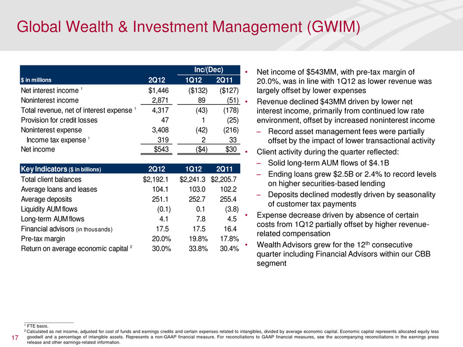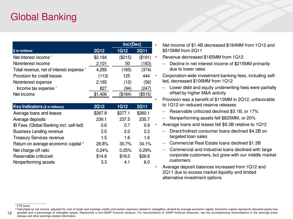 17 • Net income of $543MM, with pre-tax margin of 20.0%, was in line with 1Q12 as lower revenue was largely offset by lower expenses • Revenue declined $43MM driven by lower net interest income, primarily from continued low rate environment, offset by increased noninterest income – Record asset management fees were partially offset by the impact of lower transactional activity • Client activity during the quarter reflected: – Solid long-term AUM flows of $4.1B – Ending loans grew $2.5B or 2.4% to record levels on higher securities-based lending – Deposits declined modestly driven by seasonality of customer tax payments • Expense decrease driven by absence of certain costs from 1Q12 partially offset by higher revenue- related compensation • Wealth Advisors grew for the 12th consecutive quarter including Financial Advisors within our CBB segment Global Wealth & Investment Management (GWIM) $ in millions 2Q12 1Q12 2Q11 Net interest income 1 $1,446 ($132) ($127) Noninterest income 2,871 89 (51) Total revenue, net of interest expense 1 4,317 (43) (178) Provision for credit losses 47 1 (25) Noninterest expense 3,408 (42) (216) Income tax expense 1 319 2 33 Net income $543 ($4) $30 Key Indicators ($ in billions) 2Q12 1Q12 2Q11 Total client balances $2,192.1 $2,241.3 $2,205.7 Average loans and leases 104.1 103.0 102.2 Average deposits 251.1 252.7 255.4 Liquidity AUM flow (0.1) 0.1 (3.8) Long-term AUM flows 4.1 7.8 4.5 Financial advisors (in th usands) 17.5 17.5 16.4 Pre-tax margin 20.0% 19.8% 17.8% Return on average economic capital 2 30.0% 33.8% 30.4% Inc/(Dec) ____________________ 1 FTE basis. 2 Calculated as net income, adjusted for cost of funds and earnings credits and certain expenses related to intangibles, divided by average economic capital. Economic capital represents allocated equity less goodwill and a percentage of intangible assets. Represents a non-GAAP financial measure. For reconciliations to GAAP financial measures, see the accompanying reconciliations in the earnings press release and other earnings-related information.
