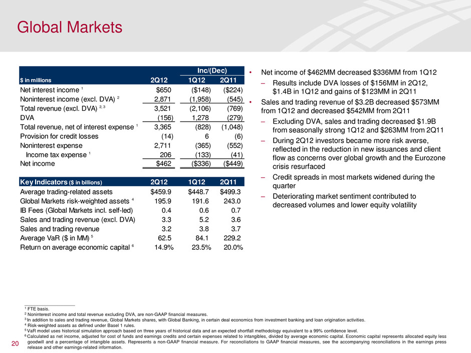 18 • Net income of $1.4B decreased $184MM from 1Q12 and $515MM from 2Q11 • Revenue decreased $165MM from 1Q12 – Decline in net interest income of $215MM primarily due to lower rates • Corporation-wide investment banking fees, including self- led, decreased $106MM from 1Q12 – Lower debt and equity underwriting fees were partially offset by higher M&A activity • Provision was a benefit of $113MM in 2Q12, unfavorable to 1Q12 on reduced reserve releases – Reservable criticized declined $3.1B, or 17% – Nonperforming assets fell $825MM, or 20% • Average loans and leases fell $9.3B relative to 1Q12 – Direct/Indirect consumer loans declined $4.2B on targeted loan sales – Commercial Real Estate loans declined $1.3B – Commercial and Industrial loans declined with large corporate customers, but grew with our middle market customers • Average deposit balances increased from 1Q12 and 2Q11 due to excess market liquidity and limited alternative investment options Global Banking $ in millions 2Q12 1Q12 2Q11 Net interest income 1 $2,184 ($215) ($191) Noninterest income 2,101 50 (183) Total revenue, net of interest expense 1 4,285 (165) (374) Provision for credit losses (113) 125 444 Noninterest expense 2,165 (12) (56) Income tax expense 1 827 (94) (247) Net income $1,406 ($184) ($515) Key Indicators ($ in billions) 2Q12 1Q12 2Q11 Average loans and leases $267.8 $277.1 $260.1 Average deposits 239.1 237.5 235.7 IB Fees (Global Banking incl. self-led) 0.6 0.7 0.9 Business Lending revenue 2.0 2.0 2.2 Treasury Servic s revenue 1.5 1.6 1.6 Return on averag economic capital 2 26.8% 30.7% 34.1%0.0 0.0 Net charge-off ratio 0.24% 0.25% 0.29% Reservable criticized $14.8 $18.0 $26.8 Nonperforming as ets 3.3 4.1 6.0 Inc/(Dec) ____________________ 1 FTE basis. 2 Calculated as net income, adjusted for cost of funds and earnings credits and certain expenses related to intangibles, divided by average economic capital. Economic capital represents allocated equity less goodwill and a percentage of intangible assets. Represents a non-GAAP financial measure. For reconciliations to GAAP financial measures, see the accompanying reconciliations in the earnings press release and other earnings-related information.