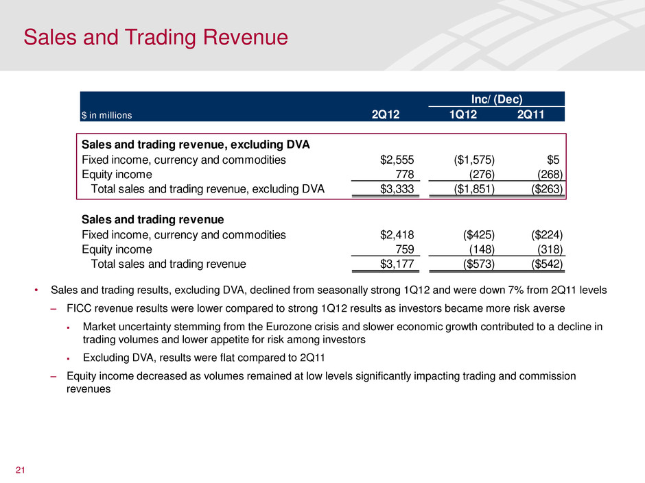 20 • Net income of $462MM decreased $336MM from 1Q12 – Results include DVA losses of $156MM in 2Q12, $1.4B in 1Q12 and gains of $123MM in 2Q11 • Sales and trading revenue of $3.2B decreased $573MM from 1Q12 and decreased $542MM from 2Q11 – Excluding DVA, sales and trading decreased $1.9B from seasonally strong 1Q12 and $263MM from 2Q11 – During 2Q12 investors became more risk averse, reflected in the reduction in new issuances and client flow as concerns over global growth and the Eurozone crisis resurfaced – Credit spreads in most markets widened during the quarter – Deteriorating market sentiment contributed to decreased volumes and lower equity volatility ____________________ 1 FTE basis. 2 Noninterest income and total revenue excluding DVA, are non-GAAP financial measures. 3 In addition to sales and trading revenue, Global Markets shares, with Global Banking, in certain deal economics from investment banking and loan origination activities. 4 Risk-weighted assets as defined under Basel 1 rules. 5 VaR model uses historical simulation approach based on three years of historical data and an expected shortfall methodology equivalent to a 99% confidence level. 6 Calculated as net income, adjusted for cost of funds and earnings credits and certain expenses related to intangibles, divided by average economic capital. Economic capital represents allocated equity less goodwill and a percentage of intangible assets. Represents a non-GAAP financial measure. For reconciliations to GAAP financial measures, see the accompanying reconciliations in the earnings press release and other earnings-related information. Global Markets $ in millions 2Q12 1Q12 2Q11 Net interest income 1 $650 ($148) ($224) Noninterest income (excl. DVA) 2 2,871 (1,958) (545) Total revenue (excl. DVA) 2, 3 3,521 (2,106) (769) DVA (156) 1,278 (279) Total revenue, net of interest expense 1 3,365 (828) (1,048) Provision for credit losses (14) 6 (6) Noninterest expense 2,711 (365) (552) Income tax expense 1 206 (133) (41) Net income $462 ($336) ($449) Key Indicators ($ in billions) 2Q12 1Q12 2Q11 Average trading-related assets $459.9 $448.7 $499.3 Global Markets risk-weighted assets 4 195.9 191.6 243.0 IB Fees (Global Markets incl. self-led) 0.4 0.6 0.7 Sales and trading reve ue (excl. DVA) 3.3 5.2 3.6 Sales and trading r venu 3.2 3.8 3.7 Average VaR ($ in MM) 5 62.5 84.1 229.2 Return on average economic capital 6 14.9% 23.5% 20.0% Inc/(Dec)
