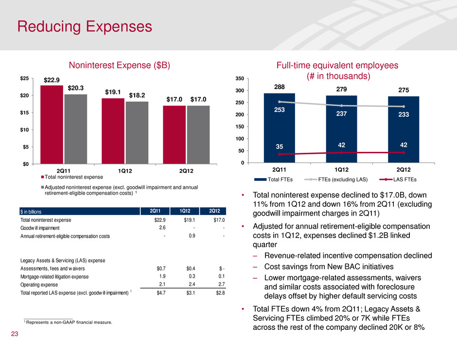 Reducing Expenses Noninterest Expense ($B) 23 288 279 275 253 237 233 35 42 42 0 50 100 150 200 250 300 350 2Q11 1Q12 2Q12 Total FTEs FTEs (excluding LAS) LAS FTEs Full-time equivalent employees (# in thousands) $22.9 $19.1 $17.0 $20.3 $18.2 $17.0 $0 $5 $10 $15 $20 $25 2Q11 1Q12 2Q12 Total noninterest expense Adjusted noninterest expense (excl. goodwill impairment and annual retirement-eligible compensation costs) $ in billions Total noninterest expense $22.9 $19.1 $17.0 Goodw ill impairment 2.6 - - Annual retirement-eligible compensation costs - 0.9 - Legacy A sets & Servicing (LAS) expense Assessments, fees and w aivers $0.7 $0.4 $ - Mortgage-related litigation expense 1.9 0.3 0.1 Operating expense 2.1 2.4 2.7 Total reported LAS expense (excl. goodw ill impairment) 1 $4.7 $3.1 $2.8 2Q121Q122Q11 1 ____________________ 1 Represents a non-GAAP financial measure. • Total noninterest expense declined to $17.0B, down 11% from 1Q12 and down 16% from 2Q11 (excluding goodwill impairment charges in 2Q11) • Adjusted for annual retirement-eligible compensation costs in 1Q12, expenses declined $1.2B linked quarter – Revenue-related incentive compensation declined – Cost savings from New BAC initiatives – Lower mortgage-related assessments, waivers and similar costs associated with foreclosure delays offset by higher default servicing costs • Total FTEs down 4% from 2Q11; Legacy Assets & Servicing FTEs climbed 20% or 7K while FTEs across the rest of the company declined 20K or 8%