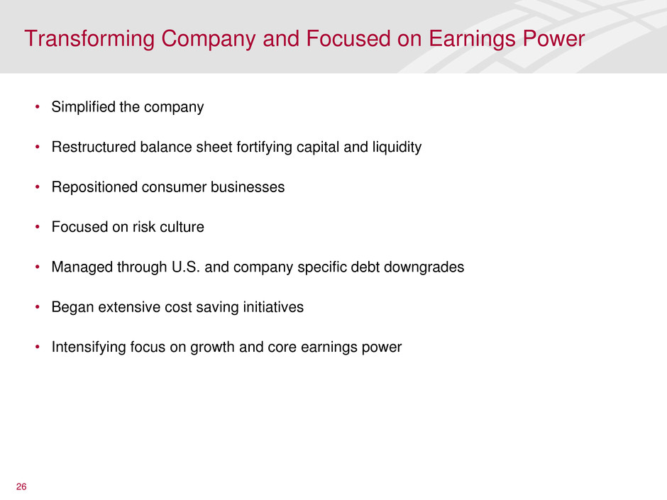 Transforming Company and Focused on Earnings Power • Simplified the company • Restructured balance sheet fortifying capital and liquidity • Repositioned consumer businesses • Focused on risk culture • Managed through U.S. and company specific debt downgrades • Began extensive cost saving initiatives • Intensifying focus on growth and core earnings power 26