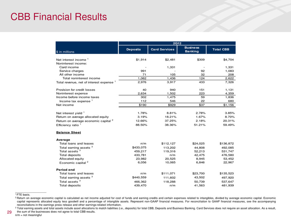 29 ____________________ 1 FTE basis. 2 Return on average economic capital is calculated as net income adjusted for cost of funds and earning credits and certain expenses related to intangibles, divided by average economic capital. Economic capital represents allocated equity less goodwill and a percentage of intangible assets. Represent non-GAAP financial measures. For reconciliation to GAAP financial measures, see the accompanying reconciliations in the earnings press release and other earnings-related information. 3 Total earning assets and total assets include asset allocations to match liabilities (i.e., deposits) for total CBB, Deposits and Business Banking. Card Services does not require an asset allocation. As a result, the sum of the businesses does not agree to total CBB results. n/m = not meaningful CBB Financial Results Net interest income 1 $1,914 $2,481 $309 $4,704 Noninterest income: Card income - 1,331 - 1,331 Service charges 991 - 92 1,083 All other income 71 105 32 208 Total noninterest income 1,062 1,436 124 2,622 Total revenue, net of interest expense 1 2,976 3,917 433 7,326 Provision for credit losses 40 940 151 1,131 Noninterest expense 2,634 1,502 223 4,359 Income before income taxes 302 1,475 59 1,836 Income tax expense 1 112 546 22 680 Net income $190 $929 $37 $1,156 Net interest yield 1 1.78% 8.81% 2.78% 3.85% Return on average allocated equity 3.19% 18.21% 1.67% 8.70% Return on average economic capital 2 12.66% 37.25% 2.18% 20.31% Efficiency ratio 1 88.50% 38.36% 51.21% 59.49% Balance Sheet Average Total loans and leases n/m $112,127 $24,025 $136,872 Total earning assets 3 $433,075 113,202 44,808 492,085 Total assets 3 459,217 119,316 52,213 531,747 Total deposits 433,781 n/m 42,475 476,580 Allocated equity 23,982 20,525 8,945 53,452 Economic capital 2 6,056 10,065 6,846 22,967 Period end Total loans and leases n/m $111,071 $23,700 $135,523 Total earning assets 3 $440,559 111,602 43,502 497,920 Total assets 3 466,362 118,288 50,739 537,647 Total deposits 439,470 n/m 41,563 481,939 $ in millions Total CBBDeposits Card Services Business Banking 2Q12