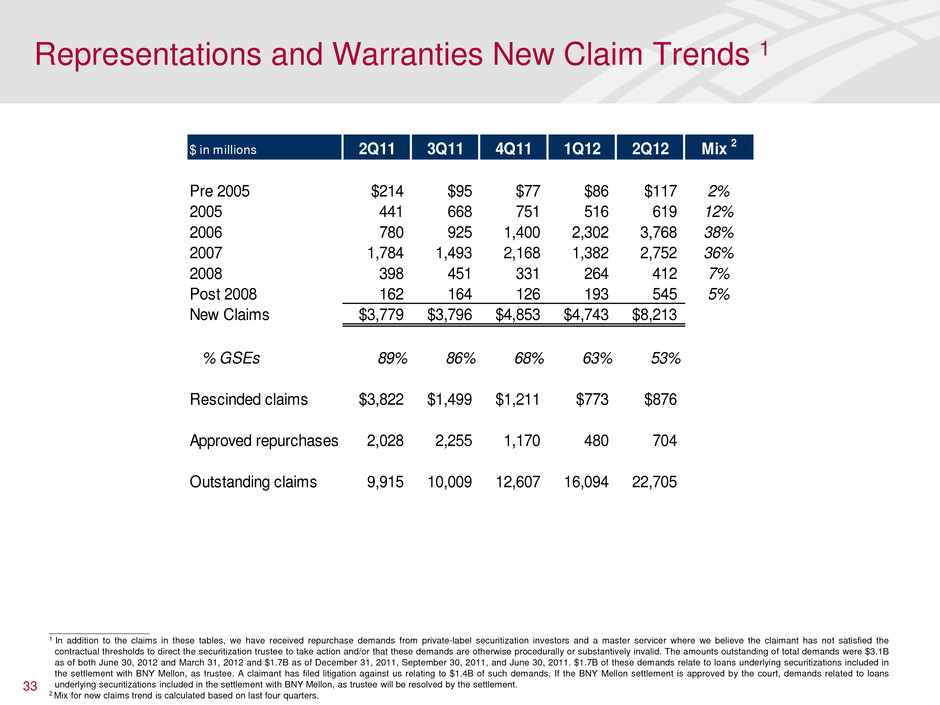 • Does not include litigation reserves established • Estimated Range of Possible Loss (RPL) above accruals up to $5B for non-GSE exposures at June 30, 2012 • Exposures identified above relate to repurchase claims associated with purported representations and warranties breaches in RMBS transactions. They do not include any exposures associated with related litigation matters, nor do they include any separate foreclosure costs and related costs and assessments, or any possible losses related to potential claims for breaches of performance of servicing obligations, potential securities law or fraud claims, potential indemnity or other claims against us, including claims related to loans guaranteed by the FHA, which could be material 32 ____________________ 1 Level of reserves established and RPL are subject to adjustments in future periods based on a number of factors including ultimate resolution of the BNY Mellon settlement, changes in estimated repurchase rates, economic conditions, home prices, and consumer and counterparty behavior, and a variety of judgmental factors. 2 Refer to pages 46 and 47 of Bank of America’s March 31, 2012 10Q on file with SEC for additional disclosures. Representations and Warranties Exposure Status as of June 30, 2012 ($B) Representations and Warranties Exposure (2004-2008 vintages) Counterparty Original Balance Outstanding Balance Have Paid Reserves Established 1 Commentary 1 GSE - FHLMC (CFC) $196 $79 FHLMC Agreement 2 GSE All Other 922 320 Reserves established 2 Second-lien monoline 81 13 Agreement with Assured and part of RPL Subsequent to 6/30/12, agreement signed with Syncora Whole loans sold 55 14 Reserves established Private l bel (CFC issued) 409 143 BNY Mellon settlement pending court approval Private label (non CFC bank issued) 242 59 Reserves established; Included in non-GSE RPL Private label (3rd party issued) 176 60 Reserves established; Included in non-GSE RPL $2,081 $688 $13.6 $15.9 (2004-2008) Originations