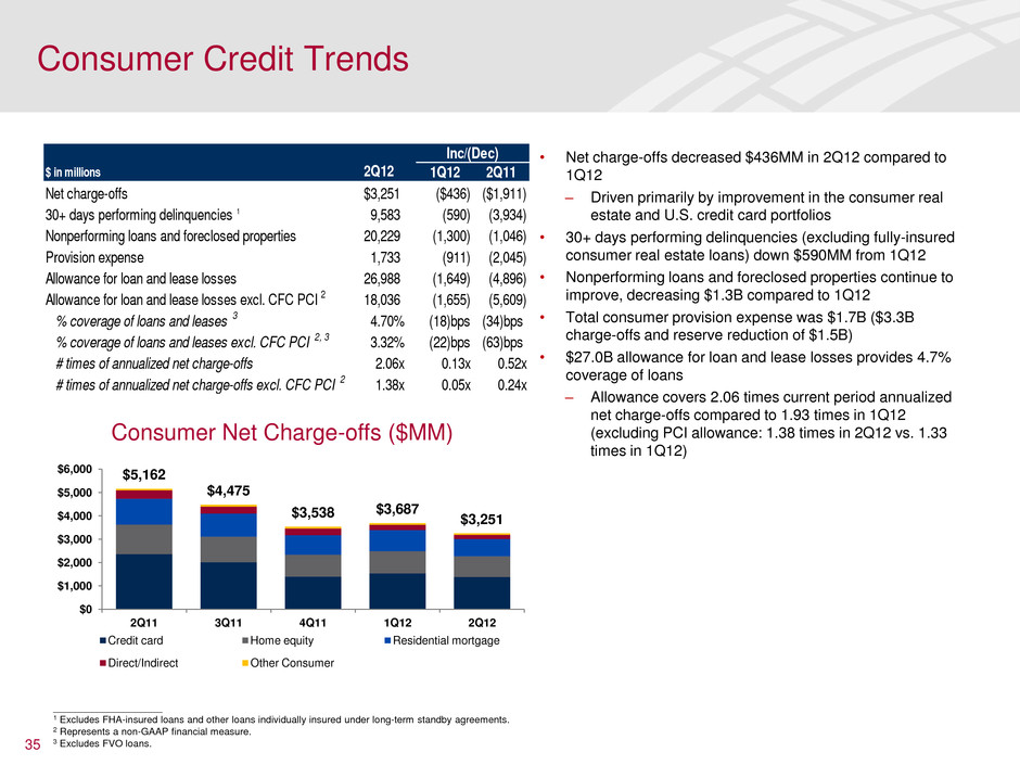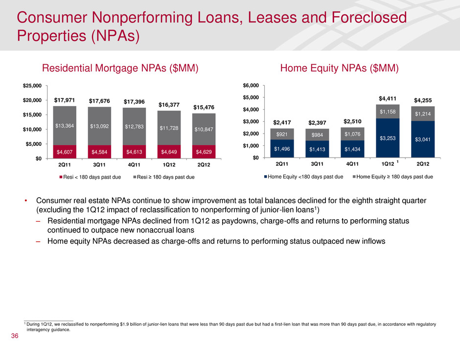 • Net charge-offs decreased $436MM in 2Q12 compared to 1Q12 – Driven primarily by improvement in the consumer real estate and U.S. credit card portfolios • 30+ days performing delinquencies (excluding fully-insured consumer real estate loans) down $590MM from 1Q12 • Nonperforming loans and foreclosed properties continue to improve, decreasing $1.3B compared to 1Q12 • Total consumer provision expense was $1.7B ($3.3B charge-offs and reserve reduction of $1.5B) • $27.0B allowance for loan and lease losses provides 4.7% coverage of loans – Allowance covers 2.06 times current period annualized net charge-offs compared to 1.93 times in 1Q12 (excluding PCI allowance: 1.38 times in 2Q12 vs. 1.33 times in 1Q12) 35 ____________________ 1 Excludes FHA-insured loans and other loans individually insured under long-term standby agreements. 2 Represents a non-GAAP financial measure. 3 Excludes FVO loans. Consumer Credit Trends $ in millions 1Q12 2Q11 Net charge-offs $3,251 ($436) ($1,911) 30+ days performing delinquencies 1 9,583 (590) (3,934) Nonperforming loans and foreclosed properties 20,229 (1,300) (1,046) Provision expense 1,733 (911) (2,045) Allowance for loan and lease losses 26,988 (1,649) (4,896) Allowance for loan and lease losses excl. CFC PCI 2 18,036 (1,655) (5,609) % coverage of loans and leases 3 4.70% (18)bps (34)bps % coverage of l ans and leases excl. CFC PCI 2, 3 3.32% (22)bps (63)bps # times of annualized net charge-offs 2.06x 0.13x 0.52x # times of annualized net charge-offs excl. CFC PCI 2 1.38x 0.05x 0.24x 2Q12 Inc/(Dec) Consumer Net Charge-offs ($MM) $5,162 $4,475 $3,538 $3,687 $3,251 $0 $1,000 $2,000 $3,000 $4,000 $5,000 $6,000 2Q11 3Q11 4Q11 1Q12 2Q12 Credit card Home equity Residential mortgage Direct/Indirect Other Consumer