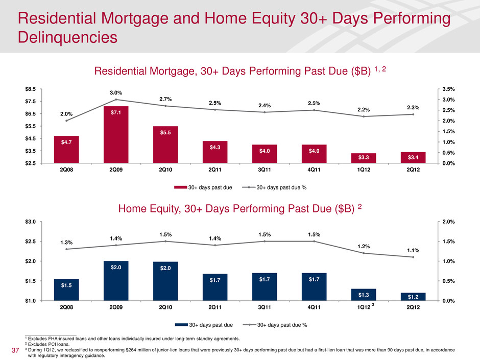 36 Residential Mortgage NPAs ($MM) Home Equity NPAs ($MM) Consumer Nonperforming Loans, Leases and Foreclosed Properties (NPAs) $4,607 $4,584 $4,613 $4,649 $4,629 $13,364 $13,092 $12,783 $11,728 $10,847 $17,971 $17,676 $17,396 $16,377 $15,476 $0 $5,000 $10,000 $15,000 $20,000 $25,000 2Q11 3Q11 4Q11 1Q12 2Q12 Resi < 180 days past due Resi ≥ 180 days past due $1,496 $1,413 $1,434 $3,253 $3,041 $921 $984 $1,076 $1,158 $1,214 $2,417 $2,397 $2,510 $4,411 $4,255 $0 $1,000 $2,000 $3,000 $4,000 $5,000 $6,000 2Q11 3Q11 4Q11 1Q12 2Q12 Home Equity <180 days past due Home Equity ≥ 180 days past due • Consumer real estate NPAs continue to show improvement as total balances declined for the eighth straight quarter (excluding the 1Q12 impact of reclassification to nonperforming of junior-lien loans1) – Residential mortgage NPAs declined from 1Q12 as paydowns, charge-offs and returns to performing status continued to outpace new nonaccrual loans – Home equity NPAs decreased as charge-offs and returns to performing status outpaced new inflows ____________________ 1 During 1Q12, we reclassified to nonperforming $1.9 billion of junior-lien loans that were less than 90 days past due but had a first-lien loan that was more than 90 days past due, in accordance with regulatory interagency guidance. 1