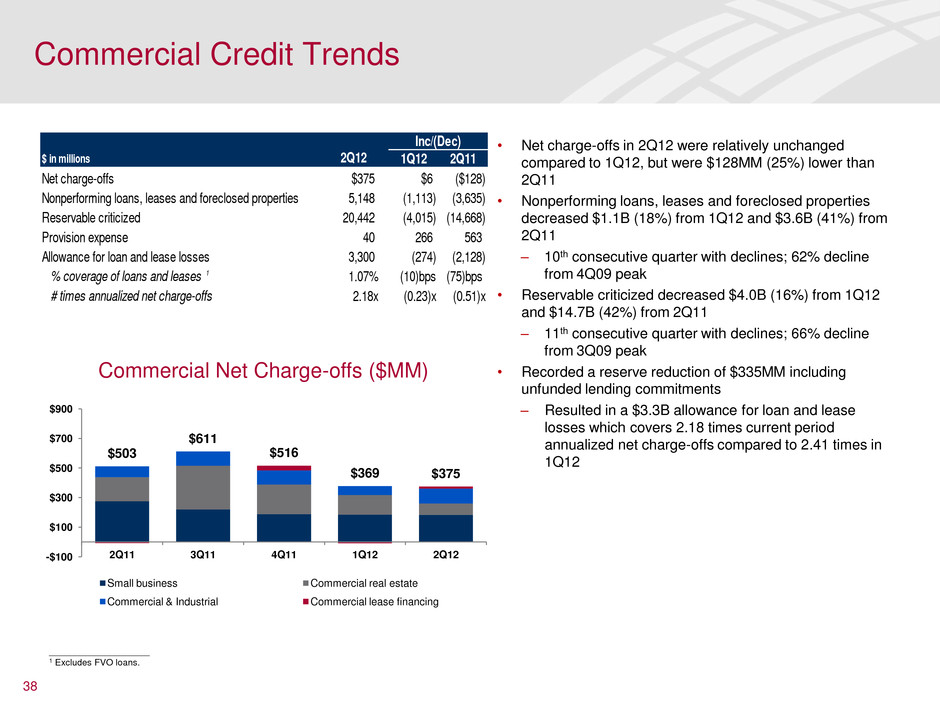 37 ____________________ 1 Excludes FHA-insured loans and other loans individually insured under long-term standby agreements. 2 Excludes PCI loans. 3 During 1Q12, we reclassified to nonperforming $264 million of junior-lien loans that were previously 30+ days performing past due but had a first-lien loan that was more than 90 days past due, in accordance with regulatory interagency guidance. Residential Mortgage, 30+ Days Performing Past Due ($B) 1, 2 Home Equity, 30+ Days Performing Past Due ($B) 2 Residential Mortgage and Home Equity 30+ Days Performing Delinquencies $4.7 $7.1 $5.5 $4.3 $4.0 $4.0 $3.3 $3.4 2.0% 3.0% 2.7% 2.5% 2.4% 2.5% 2.2% 2.3% 0.0% 0.5% 1.0% 1.5% 2.0% 2.5% 3.0% 3.5% $2.5 $3.5 $4.5 $5.5 $6.5 $7.5 $8.5 2Q08 2Q09 2Q10 2Q11 3Q11 4Q11 1Q12 2Q12 30+ days past due 30+ days past due % $1.5 $2.0 $2.0 $1.7 $1.7 $1.7 $1.3 $1.2 1.3% 1.4% 1.5% 1.4% 1.5% 1.5% 1.2% 1.1% 0.0% 0.5% 1.0% 1.5% 2.0% $1.0 $1.5 $2.0 $2.5 $3.0 2Q08 2Q09 2Q10 2Q11 3Q11 4Q11 1Q12 2Q12 30+ days past due 30+ days past due % 3