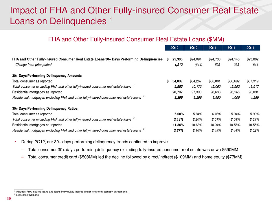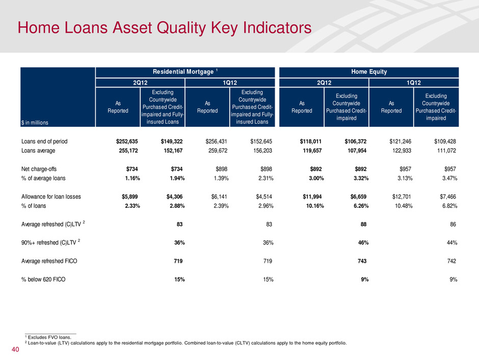39 ____________________ 1 Includes FHA-insured loans and loans individually insured under long-term standby agreements. 2 Excludes PCI loans. FHA and Other Fully-insured Consumer Real Estate Loans ($MM) • During 2Q12, our 30+ days performing delinquency trends continued to improve – Total consumer 30+ days performing delinquency excluding fully-insured consumer real estate was down $590MM – Total consumer credit card ($508MM) led the decline followed by direct/indirect ($109MM) and home equity ($77MM) Impact of FHA and Other Fully-insured Consumer Real Estate Loans on Delinquencies 1 2Q12 1Q12 4Q11 3Q11 2Q11 FHA and Other Fully-insured Consumer Real Estate Loans 30+ Days Performing Delinquencies 25,306$ $24,094 $24,738 $24,140 $23,802 Change from prior period 1,212 (644) 598 338 841 30+ Days Performing Delinquency Amounts Total consumer as reported 34,889$ $34,267 $36,801 $36,692 $37,319 Total consumer excluding FHA and other fully-insured consumer real estate loans 2 9,583 10,173 12,063 12,552 13,517 Residential mortgages as reported 28,702 27,390 28,688 28,146 28,091 Residential mortgages excluding FHA and other fully-insured consumer real estate loans 2 3,396 3,296 3,950 4,006 4,289 30+ Days Performing Delinquency Ratios Total consumer as reported 6.08% 5.84% 6.06% 5.94% 5.90% Total consumer excluding FHA and other fully-insured consumer real estate loans 2 2.13% 2.20% 2.51% 2.54% 2.63% Residential mortgages as reported 11.36% 10.68% 10.94% 10.56% 10.55% Residential mortgages excluding FHA and other fully-insured consumer real estate loans 2 2.27% 2.16% 2.49% 2.44% 2.52%
