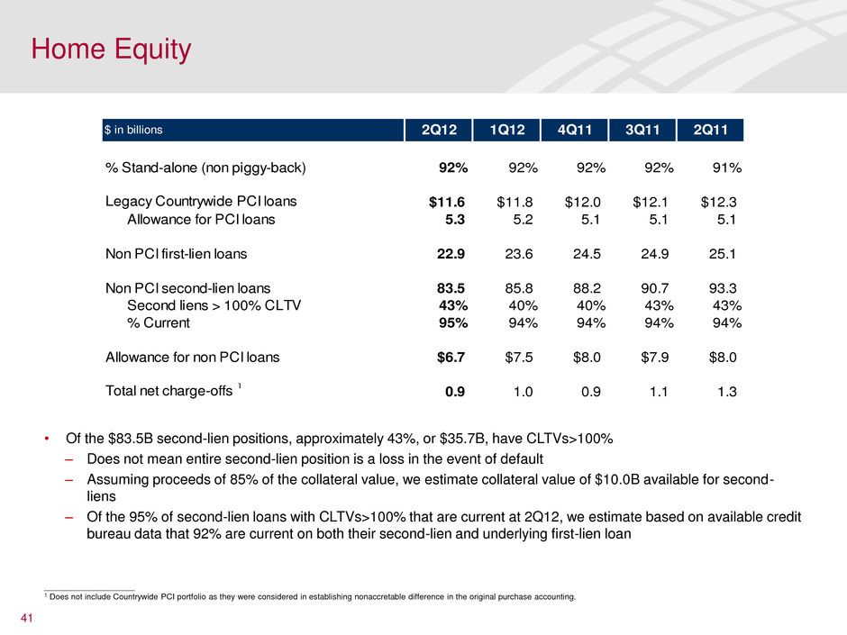 40 ____________________ 1 Excludes FVO loans. 2 Loan-to-value (LTV) calculations apply to the residential mortgage portfolio. Combined loan-to-value (CLTV) calculations apply to the home equity portfolio. Home Loans Asset Quality Key Indicators As Reported Excluding Countrywide Purchased Credit- impaired and Fully- insured Loans As Reported Excluding Countrywide Purchased Credit- impaired and Fully- insured Loans As Reported Excluding Countrywide Purchased Credit- impaired As Reported Excluding Countrywide Purchased Credit- impaired Loans end of period $252,635 $149,322 $256,431 $152,645 $118,011 $106,372 $121,246 $109,428 Loans average 255,172 152,167 259,672 156,203 119,657 107,954 122,933 111,072 Net charge-offs $734 $734 $898 $898 $892 $892 $957 $957 % of average loans 1.16% 1.94% 1.39% 2.31% 3.00% 3.32% 3.13% 3.47% Allowance for loan losses $5,899 $4,306 $6,141 $4,514 $11,994 $6,659 $12,701 $7,466 % of loans 2.33% 2.88% 2.39% 2.96% 10.16% 6.26% 10.48% 6.82% Average refreshed (C)LTV 2 83 83 88 86 90%+ refreshed (C)LTV 2 36% 36% 46% 44% Average refreshed FICO 719 719 743 742 % below 620 FICO 15% 15% 9% 9% $ in millions Residential Mortgage 1 Home Equity 2Q12 1Q12 2Q12 1Q12