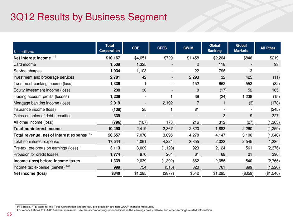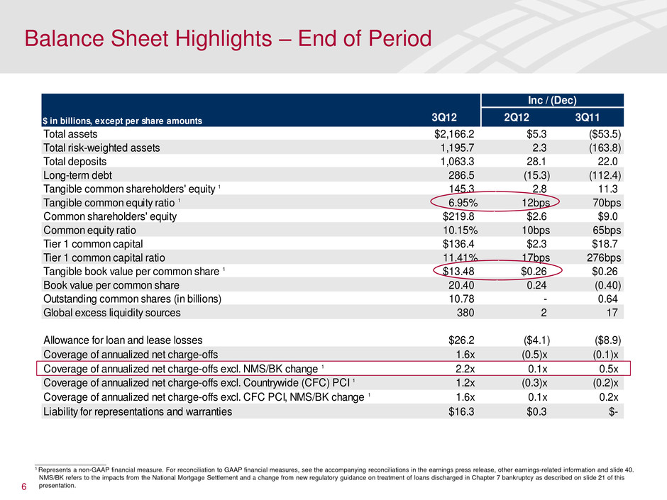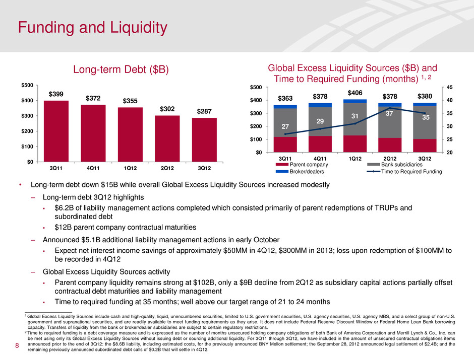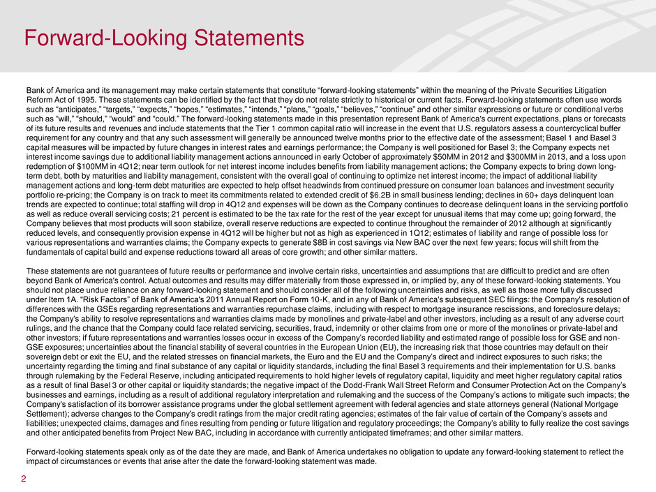 Bank of America and its management may make certain statements that constitute “forward-looking statements” within the meaning of the Private Securities Litigation Reform Act of 1995. These statements can be identified by the fact that they do not relate strictly to historical or current facts. Forward-looking statements often use words such as “anticipates,” “targets,” “expects,” “hopes,” “estimates,” “intends,” “plans,” “goals,” “believes,” “continue” and other similar expressions or future or conditional verbs such as “will,” “should,” “would” and “could.” The forward-looking statements made in this presentation represent Bank of America's current expectations, plans or forecasts of its future results and revenues and include statements that the Tier 1 common capital ratio will increase in the event that U.S. regulators assess a countercyclical buffer requirement for any country and that any such assessment will generally be announced twelve months prior to the effective date of the assessment; Basel 1 and Basel 3 capital measures will be impacted by future changes in interest rates and earnings performance; the Company is well positioned for Basel 3; the Company expects net interest income savings due to additional liability management actions announced in early October of approximately $50MM in 2012 and $300MM in 2013, and a loss upon redemption of $100MM in 4Q12; near term outlook for net interest income includes benefits from liability management actions; the Company expects to bring down long- term debt, both by maturities and liability management, consistent with the overall goal of continuing to optimize net interest income; the impact of additional liability management actions and long-term debt maturities are expected to help offset headwinds from continued pressure on consumer loan balances and investment security portfolio re-pricing; the Company is on track to meet its commitments related to extended credit of $6.2B in small business lending; declines in 60+ days delinquent loan trends are expected to continue; total staffing will drop in 4Q12 and expenses will be down as the Company continues to decrease delinquent loans in the servicing portfolio as well as reduce overall servicing costs; 21 percent is estimated to be the tax rate for the rest of the year except for unusual items that may come up; going forward, the Company believes that most products will soon stabilize, overall reserve reductions are expected to continue throughout the remainder of 2012 although at significantly reduced levels, and consequently provision expense in 4Q12 will be higher but not as high as experienced in 1Q12; estimates of liability and range of possible loss for various representations and warranties claims; the Company expects to generate $8B in cost savings via New BAC over the next few years; focus will shift from the fundamentals of capital build and expense reductions toward all areas of core growth; and other similar matters. These statements are not guarantees of future results or performance and involve certain risks, uncertainties and assumptions that are difficult to predict and are often beyond Bank of America's control. Actual outcomes and results may differ materially from those expressed in, or implied by, any of these forward-looking statements. You should not place undue reliance on any forward-looking statement and should consider all of the following uncertainties and risks, as well as those more fully discussed under Item 1A. “Risk Factors” of Bank of America's 2011 Annual Report on Form 10-K, and in any of Bank of America's subsequent SEC filings: the Company's resolution of differences with the GSEs regarding representations and warranties repurchase claims, including with respect to mortgage insurance rescissions, and foreclosure delays; the Company's ability to resolve representations and warranties claims made by monolines and private-label and other investors, including as a result of any adverse court rulings, and the chance that the Company could face related servicing, securities, fraud, indemnity or other claims from one or more of the monolines or private-label and other investors; if future representations and warranties losses occur in excess of the Company’s recorded liability and estimated range of possible loss for GSE and non- GSE exposures; uncertainties about the financial stability of several countries in the European Union (EU), the increasing risk that those countries may default on their sovereign debt or exit the EU, and the related stresses on financial markets, the Euro and the EU and the Company’s direct and indirect exposures to such risks; the uncertainty regarding the timing and final substance of any capital or liquidity standards, including the final Basel 3 requirements and their implementation for U.S. banks through rulemaking by the Federal Reserve, including anticipated requirements to hold higher levels of regulatory capital, liquidity and meet higher regulatory capital ratios as a result of final Basel 3 or other capital or liquidity standards; the negative impact of the Dodd-Frank Wall Street Reform and Consumer Protection Act on the Company’s businesses and earnings, including as a result of additional regulatory interpretation and rulemaking and the success of the Company’s actions to mitigate such impacts; the Company's satisfaction of its borrower assistance programs under the global settlement agreement with federal agencies and state attorneys general (National Mortgage Settlement); adverse changes to the Company's credit ratings from the major credit rating agencies; estimates of the fair value of certain of the Company’s assets and liabilities; unexpected claims, damages and fines resulting from pending or future litigation and regulatory proceedings; the Company’s ability to fully realize the cost savings and other anticipated benefits from Projec