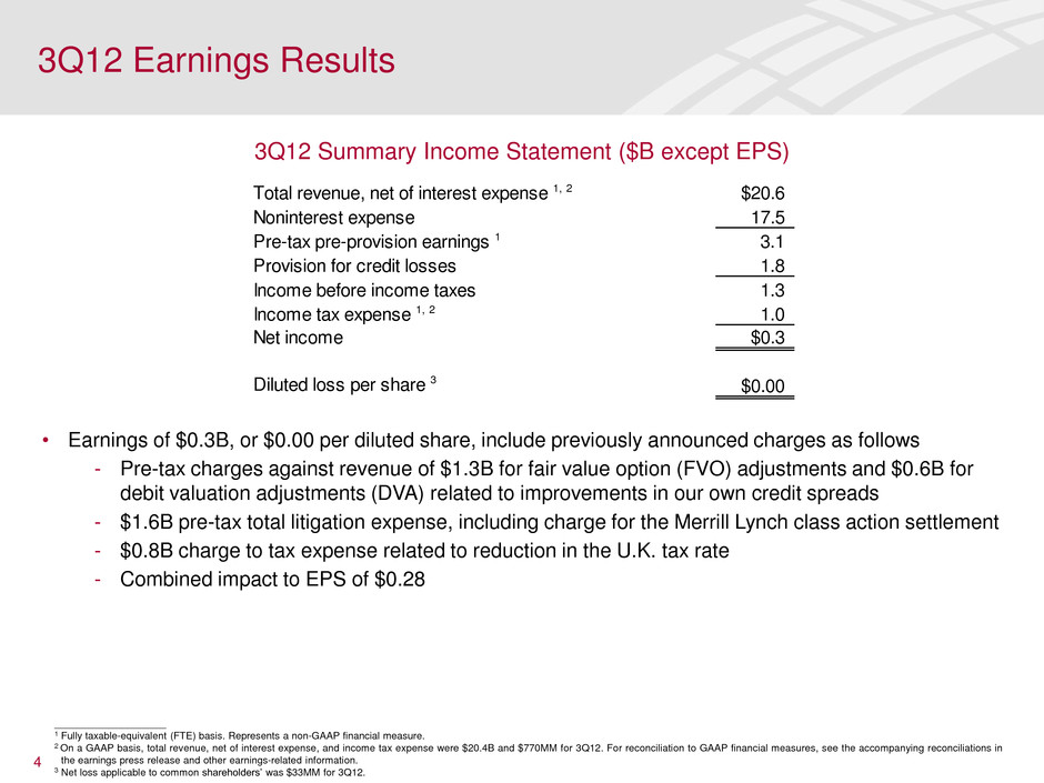 • The information contained herein is preliminary and based on company data available at the time of the earnings presentation. It speaks only as of the particular date or dates included in the accompanying slides. Bank of America does not undertake an obligation to, and disclaims any duty to, update any of the information provided • Certain prior period amounts have been reclassified to conform to current period presentation • The Company’s estimates under Basel 3 are based on its current understanding of both the final U.S. market risk rules and the U.S. Basel 3 Advanced NPR, assuming all relevant regulatory model approvals. These estimates under Basel 3 will evolve over time as the Company’s businesses change and as a result of further rulemaking or clarification by U.S. regulatory agencies. The final U.S. market risk rules and U.S. Basel 3 Advanced NPR require approval by banking regulators of certain models used as part of risk-weighted asset calculations. If these models are not approved, the Company’s capital ratio would likely be adversely impacted, which in some cases could be significant. In addition to Basel 1 requirements and capital ratios, these estimates assist management, investors and analysts in assessing capital adequacy and comparability under Basel 3 capital standards to other financial services companies. The Company continues to evaluate the potential impact of proposed rules and anticipates it will be in compliance with any final rules by the proposed effective dates • Certain financial measures contained herein represent non-GAAP financial measures. For more information about the non-GAAP financial measures contained herein, please see the presentation of the most directly comparable financial measures calculated in accordance with GAAP and accompanying reconciliations in the earnings press release for the quarter ended September 30, 2012 and other earnings-related information available through the Bank of America Investor Relations web site at: http://investor.bankofamerica.com 3 Important Presentation Information