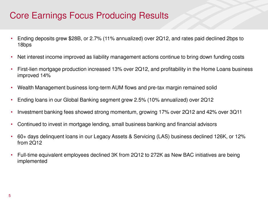 3Q12 Earnings Results 4 3Q12 Summary Income Statement ($B except EPS) ____________________ 1 Fully taxable-equivalent (FTE) basis. Represents a non-GAAP financial measure. 2 On a GAAP basis, total revenue, net of interest expense, and income tax expense were $20.4B and $770MM for 3Q12. For reconciliation to GAAP financial measures, see the accompanying reconciliations in the earnings press release and other earnings-related information. 3 Net loss applicable to common shareholders’ was $33MM for 3Q12. Total revenue, net of interest expense 1, 2 $20.6 Noninterest expense 17.5 Pre-tax pre-provision earnings 1 3.1 Provision for credit losses 1.8 Income before income taxes 1.3 Income tax expense 1, 2 1.0 Net income $0.3 Diluted loss per share 3 $0.00 • Earnings of $0.3B, or $0.00 per diluted share, include previously announced charges as follows Pre-tax charges against revenue of $1.3B for fair value option (FVO) adjustments and $0.6B for debit valuation adjustments (DVA) related to improvements in our own credit spreads $1.6B pre-tax total litigation expense, including charge for the Merrill Lynch class action settlement $0.8B charge to tax expense related to reduction in the U.K. tax rate Combined impact to EPS of $0.28