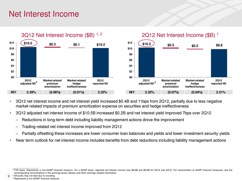 Funding and Liquidity • Long-term debt down $15B while overall Global Excess Liquidity Sources increased modestly – Long-term debt 3Q12 highlights $6.2B of liability management actions completed which consisted primarily of parent redemptions of TRUPs and subordinated debt $12B parent company contractual maturities – Announced $5.1B additional liability management actions in early October Expect net interest income savings of approximately $50MM in 4Q12, $300MM in 2013; loss upon redemption of $100MM to be recorded in 4Q12 – Global Excess Liquidity Sources activity Parent company liquidity remains strong at $102B, only a $9B decline from 2Q12 as subsidiary capital actions partially offset contractual debt maturities and liability management Time to required funding at 35 months; well above our target range of 21 to 24 months 8 Global Excess Liquidity Sources ($B) and Time to Required Funding (months) 1, 2 1 Global Excess Liquidity Sources include cash and high-quality, liquid, unencumbered securities, limited to U.S. government securities, U.S. agency securities, U.S. agency MBS, and a select group of non-U.S. government and supranational securities, and are readily available to meet funding requirements as they arise. It does not include Federal Reserve Discount Window or Federal Home Loan Bank borrowing capacity. Transfers of liquidity from the bank or broker/dealer subsidiaries are subject to certain regulatory restrictions. 2 Time to required funding is a debt coverage measure and is expressed as the number of months unsecured holding company obligations of both Bank of America Corporation and Merrill Lynch & Co., Inc. can be met using only its Global Excess Liquidity Sources without issuing debt or sourcing additional liquidity. For 3Q11 through 3Q12, we have included in the amount of unsecured contractual obligations items announced prior to the end of 3Q12: the $8.6B liability, including estimated costs, for the previously announced BNY Mellon settlement; the September 28, 2012 announced legal settlement of $2.4B; and the remaining previously announced subordinated debt calls of $0.2B that will settle in 4Q12. $363 $378 $406 $378 $380 27 29 31 37 35 20 25 30 35 40 45 $0 $100 $200 $300 $400 $500 3Q11 4Q11 1Q12 2Q12 3Q12 Parent company Bank subsidiaries Broker/dealers Time to Required Funding Long-term Debt ($B) $399 $372 $355 $302 $287 $0 $100 $200 $300 $400 $500 3Q11 4Q11 1Q12 2Q12 3Q12