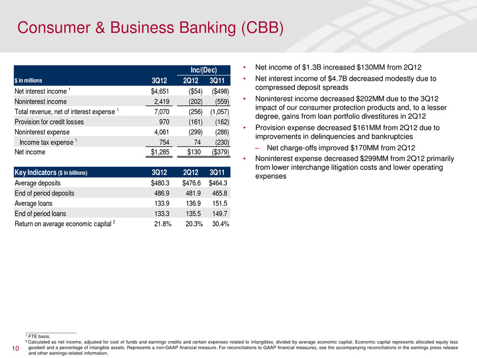 • 3Q12 net interest income and net interest yield increased $0.4B and 11bps from 2Q12, partially due to less negative market-related impacts of premium amortization expense on securities and hedge ineffectiveness • 3Q12 adjusted net interest income of $10.5B increased $0.2B and net interest yield improved 7bps over 2Q12 – Reductions in long-term debt including liability management actions drove the improvement – Trading-related net interest income improved from 2Q12 – Partially offsetting these increases are lower consumer loan balances and yields and lower investment security yields • Near term outlook for net interest income includes benefits from debt reductions including liability management actions 9 2Q12 Net Interest Income ($B) 1 $10.3 $9.8 $0.3 $0.2 $0 $2 $4 $6 $8 $10 $12 2Q12 adjusted NII Market-related premium amortization Market-related hedge ineffectiveness 2Q12 reported NII $10.5 $10.2 $0.3 $0.1 $0 $2 $4 $6 $8 $10 $12 3Q12 adjusted NII Market-related premium amortization Market-related hedge ineffectiveness 3Q12 reported NII 3Q12 Net Interest Income ($B) 1, 2 NIY 2.32% (0.07%) (0.04%) 2.21%NIY 2.39% (0.06%) (0. 1%) 2.32% Net Interest Income ____________________ 1 FTE basis. Represents a non-GAAP financial measure. On a GAAP basis, reported net interest income was $9.9B and $9.5B for 3Q12 and 2Q12. For reconciliation to GAAP financial measures, see the accompanying reconciliations in the earnings press release and other earnings-related information. 2 Amounts may not total due to rounding. 3 Represents a non-GAAP financial measure. 3 3