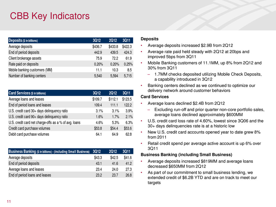 10 • Net income of $1.3B increased $130MM from 2Q12 • Net interest income of $4.7B decreased modestly due to compressed deposit spreads • Noninterest income decreased $202MM due to the 3Q12 impact of our consumer protection products and, to a lesser degree, gains from loan portfolio divestitures in 2Q12 • Provision expense decreased $161MM from 2Q12 due to improvements in delinquencies and bankruptcies – Net charge-offs improved $170MM from 2Q12 • Noninterest expense decreased $299MM from 2Q12 primarily from lower interchange litigation costs and lower operating expenses Consumer & Business Banking (CBB) $ in millions 2Q12 3Q11 Net interest income 1 $4,651 ($54) ($498) Noninterest income 2,419 (202) (559) Total revenue, net of interest expense 1 7,070 (256) (1,057) Provision for credit losses 970 (161) (162) Noninterest expense 4,061 (299) (286) Income tax expense 1 754 74 (230) Net income $1,285 $130 ($379) Key Indicators ($ in billions) 3Q12 2Q12 3Q11 Average deposits $480.3 $476.6 $464.3 End of period deposits 486.9 481.9 465.8 Average loans 133.9 136.9 151.5 End of period loans 133.3 135.5 149.7 Return on average economic capital 2 21.8% 20.3% 30.4% Inc/(Dec) 3Q12 ____________________ 1 FTE basis. 2 Calculated as net income, adjusted for cost of funds and earnings credits and certain expenses related to intangibles, divided by average economic capital. Economic capital represents allocated equity less goodwill and a percentage of intangible assets. Represents a non-GAAP financial measure. For reconciliations to GAAP financial measures, see the accompanying reconciliations in the earnings press release and other earnings-related information.