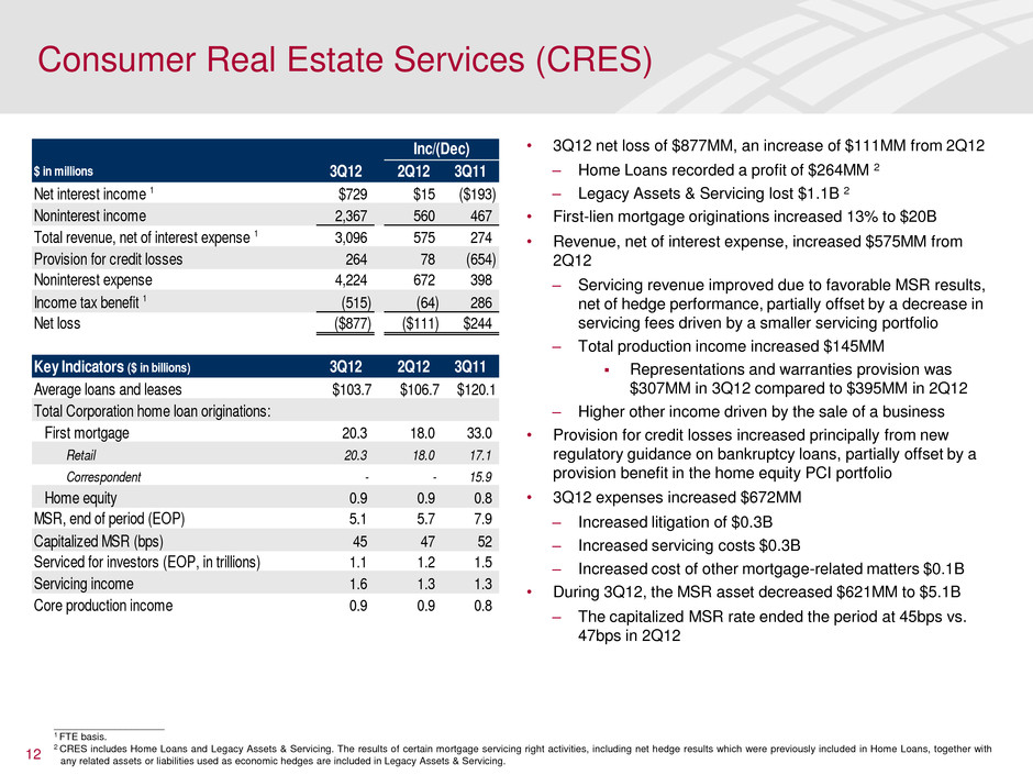 11 Deposits • Average deposits increased $2.9B from 2Q12 • Average rate paid held steady with 2Q12 at 20bps and improved 5bps from 3Q11 • Mobile Banking customers of 11.1MM, up 8% from 2Q12 and 30% from 3Q11 – 1.7MM checks deposited utilizing Mobile Check Deposits, a capability introduced in 3Q12 • Banking centers declined as we continued to optimize our delivery network around customer behaviors Card Services • Average loans declined $2.4B from 2Q12 – Excluding run-off and prior quarter non-core portfolio sales, average loans declined approximately $600MM • U.S. credit card loss rate of 4.60%, lowest since 3Q06 and the 30+ days delinquencies rate is at a historic low • New U.S. credit card accounts opened year to date grew 8% from 2011 • Retail credit spend per average active account is up 6% over 3Q11 Business Banking (including Small Business) • Average deposits increased $819MM and average loans decreased $650MM from 2Q12 • As part of our commitment to small business lending, we extended credit of $6.2B YTD and are on track to meet our targets CBB Key Indicators Deposits ($ in billions) 3Q12 2Q12 3Q11 Average deposits $436.7 $433.8 $422.3 End of period deposits 442.9 439.5 424.3 Client brokerage assets 75.9 72.2 61.9 Rate paid on deposits 0.20% 0.20% 0.25% Mobile banking customers (MM) 11.1 10.3 8.5 Number of banking centers 5,540 5,594 5,715 Card Services ($ in billions) 3Q12 2Q12 3Q11 Average loans and leases $109.7 $112.1 $123.5 End of period loans and leases 109.4 111.1 122.2 U.S. credit card 30+ days delinquency ratio 3.1% 3.1% 3.9% U.S. credit card 90+ days delinquency ratio 1.6% 1.7% 2.1% U.S. credit card net charge-offs as a % of avg. loans 4.6% 5.3% 6.3% Credit card purchase volumes $53.8 $54.4 $53.6 Debit card purchase volumes 64.1 64.9 62.8 usiness Banking ($ in billions) - (including Small Business) 3Q12 2Q12 3Q11 Average deposits $43.3 $42.5 $41.6 End of period deposits 43.1 41.6 41.2 Average loans and leases 23.4 24.0 27.3 End of period loans and leases 23.2 23.7 26.8