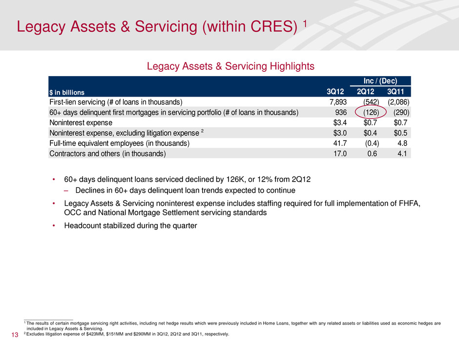 12 ____________________ 1 FTE basis. 2 CRES includes Home Loans and Legacy Assets & Servicing. The results of certain mortgage servicing right activities, including net hedge results which were previously included in Home Loans, together with any related assets or liabilities used as economic hedges are included in Legacy Assets & Servicing. • 3Q12 net loss of $877MM, an increase of $111MM from 2Q12 – Home Loans recorded a profit of $264MM 2 – Legacy Assets & Servicing lost $1.1B 2 • First-lien mortgage originations increased 13% to $20B • Revenue, net of interest expense, increased $575MM from 2Q12 – Servicing revenue improved due to favorable MSR results, net of hedge performance, partially offset by a decrease in servicing fees driven by a smaller servicing portfolio – Total production income increased $145MM Representations and warranties provision was $307MM in 3Q12 compared to $395MM in 2Q12 – Higher other income driven by the sale of a business • Provision for credit losses increased principally from new regulatory guidance on bankruptcy loans, partially offset by a provision benefit in the home equity PCI portfolio • 3Q12 expenses increased $672MM – Increased litigation of $0.3B – Increased servicing costs $0.3B – Increased cost of other mortgage-related matters $0.1B • During 3Q12, the MSR asset decreased $621MM to $5.1B – The capitalized MSR rate ended the period at 45bps vs. 47bps in 2Q12 Consumer Real Estate Services (CRES) $ in millions 2Q12 3Q11 Net interest income 1 $729 $15 ($193) Noninterest income 2,367 560 467 Total revenue, net of interest expense 1 3,096 575 274 Provision for credit losses 264 78 (654) Noninterest expense 4,224 672 398 Income tax benefit 1 (515) (64) 286 Net loss ($877) ($111) $244 Key Indicators ($ in billions) 3Q12 2Q12 3Q11 Average loans and leases $103.7 $106.7 $120.1 Total Corporation home loan originations: First mortgage 20.3 18.0 33.0 Retail 20.3 18.0 17.1 Correspondent - - 15.9 Home equity 0.9 0.9 0.8 MSR, end of period (EOP) 5.1 5.7 7.9 Capitalized MSR (bps) 45 47 52 Serviced for investors (EOP, trillions) 1.1 1.2 1.5 Servicing income 1.6 1.3 1.3 Core production income 0.9 0.9 0.8 Inc/(Dec) 3Q12