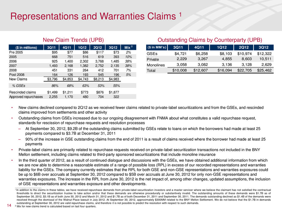 13 Legacy Assets & Servicing (within CRES) 1 ____________________ 1 The results of certain mortgage servicing right activities, including net hedge results which were previously included in Home Loans, together with any related assets or liabilities used as economic hedges are included in Legacy Assets & Servicing. 2 Excludes litigation expense of $423MM, $151MM and $290MM in 3Q12, 2Q12 and 3Q11, respectively. • 60+ days delinquent loans serviced declined by 126K, or 12% from 2Q12 – Declines in 60+ days delinquent loan trends expected to continue • Legacy Assets & Servicing noninterest expense includes staffing required for full implementation of FHFA, OCC and National Mortgage Settlement servicing standards • Headcount stabilized during the quarter $ in billions 2Q12 3Q11 First-lien servicing (# of loans in thousands) 7,893 (542) (2,086) 60+ days delinquent first mortgages in servicing portfolio (# of loans in thousands) 936 (126) (290) Noninterest expense $3.4 $0.7 $0.7 Noninterest expense, excluding litigation expense 2 $3.0 $0.4 $0.5 Full-time equivalent employees (in thousands) 41.7 (0.4) 4.8 Contractors and others (in thousands) 17.0 0.6 4.1 Inc / (Dec) 3Q12 Legacy Assets & Servicing Highlights