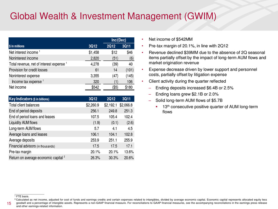 Representations and Warranties Claims 1 14 • New claims declined compared to 2Q12 as we received fewer claims related to private-label securitizations and from the GSEs, and rescinded claims improved from settlements and other activity • Outstanding claims from GSEs increased due to our ongoing disagreement with FNMA about what constitutes a valid repurchase request, standards for rescission of repurchase requests and resolution processes – At September 30, 2012, $9.2B of the outstanding claims submitted by GSEs relate to loans on which the borrowers had made at least 25 payments compared to $3.7B at December 31, 2011 – 90% of the increase in GSE outstanding claims from the end of 2011 is a result of claims received where the borrower had made at least 25 payments • Private-label claims are primarily related to repurchase requests received on private-label securitization transactions not included in the BNY Mellon settlement, including claims related to third-party sponsored securitizations that include monoline insurance • In the third quarter of 2012, as a result of continued dialogue and discussions with the GSEs, we have obtained additional information from which we are now able to determine a reasonable estimate of a range of possible loss (RPL) in excess of our recorded representations and warranties liability for the GSEs. The company currently estimates that the RPL for both GSE and non-GSE representations and warranties exposures could be up to $6B over accruals at September 30, 2012 compared to $5B over accruals at June 30, 2012 for only non-GSE representations and warranties exposures. The increase in the RPL from June 30, 2012 is the net impact of, among other changes, updated assumptions, the inclusion of GSE representations and warranties exposure and other developments. ($ in MM's) 3Q11 4Q11 1Q12 2Q12 3Q12 GSEs $4,721 $6,258 $8,103 $10,974 $12,322 Private 2,229 3,267 4,855 8,603 10,511 Monolines 3,058 3,082 3,136 3,128 2,629 Total $10,008 $12,607 $16,094 $22,705 $25,462 Outstanding Claims by Counterparty (UPB) ____________________ 1 In addition to the claims in these tables, we have received repurchase demands from private-label securitization investors and a master servicer where we believe the claimant has not satisfied the contractual thresholds to direct the securitization trustee to take action and/or that these demands are otherwise procedurally or substantively invalid. The outstanding amounts of these demands were $1.7B as of September 30, 2012, $3.1B as of both June 30, 2012 and March 31, 2012 and $1.7B as of both December 31, 2011 and September 30, 2011. The demands outstanding declined as $1.4B of the demands were resolved through the dismissal of the Walnut Place lawsuit in July 2012. At September 30, 2012, approximately $300MM related to the BNY Mellon Settlement. We do not believe that the $1.7B in demands outstanding at September 30, 2012 are valid repurchase claims, and therefore it is not possible to predict the resolution with respect to such demands. 2 Mix for new claims trend is calculated based on last four quarters. ($ in millions) 3Q11 4Q11 1Q12 2Q12 3Q12 Mix 2 Pre 2005 $95 $77 $86 $117 $73 2% 2005 668 751 516 619 393 10% 2006 925 1,400 2,302 3,768 1,485 38% 2007 1,493 2,168 1,382 2,752 2,135 38% 2008 451 331 264 412 701 7% Post 2008 164 126 193 545 196 5% New Claims $3,796 $4,853 $4,743 $8,213 $4,983 % GSEs 86% 68% 63% 53% 55% Rescinded claims $1,499 $1,2 1 $773 $876 $1,877 Approved repurchases 2,255 1,170 480 704 322 New Claim Trends (UPB)