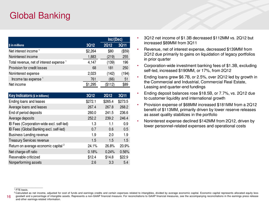 15 • Net income of $542MM • Pre-tax margin of 20.1%, in line with 2Q12 • Revenue declined $39MM due to the absence of 2Q seasonal items partially offset by the impact of long-term AUM flows and market origination revenue • Expense decrease driven by lower support and personnel costs, partially offset by litigation expense • Client activity during the quarter reflected – Ending deposits increased $6.4B or 2.5% – Ending loans grew $2.1B or 2.0% – Solid long-term AUM flows of $5.7B 13th consecutive positive quarter of AUM long-term flows Global Wealth & Investment Management (GWIM) $ in millions 2Q12 3Q11 Net interest income 1 $1,458 $12 $46 Noninterest income 2,820 (51) (6) Total revenue, net of interest expense 1 4,278 (39) 40 Provision for credit losses 61 14 (101) Noninterest expense 3,355 (47) (145) Income tax expense 1 320 (1) 106 Net income $542 ($5) $180 Key Indicators ($ in billions) 3Q12 2Q12 3Q11 Total client balances $2,260.9 $2,192.1 $2,066.8 End of period deposits 256.1 249.8 251.3 End of period loans and leases 107.5 105.4 102.4 Liquidity AUM flows (1.9) (0.1) (2.6) Long-term AUM flows 5.7 4.1 4.5 Average loans and l ases 106.1 104.1 102.8 Average deposits 253.9 251.1 255.9 Financial advisors (in th usands) 17.5 17.5 17.1 Pre-tax margin 20.1% 20.1% 13.6% Return on average economic capital 2 26.3% 30.3% 20.6% Inc/(Dec) 3Q12 ____________________ 1 FTE basis. 2 Calculated as net income, adjusted for cost of funds and earnings credits and certain expenses related to intangibles, divided by average economic capital. Economic capital represents allocated equity less goodwill and a percentage of intangible assets. Represents a non-GAAP financial measure. For reconciliations to GAAP financial measures, see the accompanying reconciliations in the earnings press release and other earnings-related information.