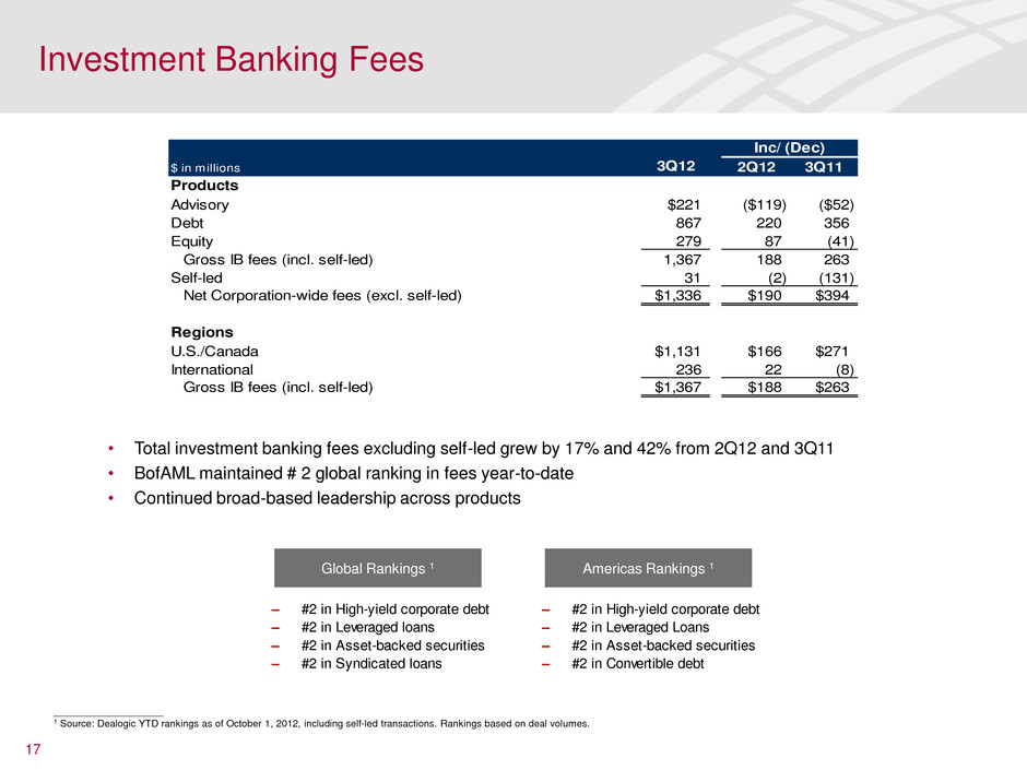 16 • 3Q12 net income of $1.3B decreased $112MM vs. 2Q12 but increased $89MM from 3Q11 • Revenue, net of interest expense, decreased $139MM from 2Q12 due primarily to gains on liquidation of legacy portfolios in prior quarter • Corporation-wide investment banking fees of $1.3B, excluding self-led, increased $190MM, or 17%, from 2Q12 • Ending loans grew $6.7B, or 2.5%, over 2Q12 led by growth in the Commercial and Industrial, Commercial Real Estate, Leasing and quarter-end fundings • Ending deposit balances rose $18.5B, or 7.7%, vs. 2Q12 due to customer liquidity and international growth • Provision expense of $68MM increased $181MM from a 2Q12 benefit of $113MM, primarily driven by lower reserve releases as asset quality stabilizes in the portfolio • Noninterest expense declined $142MM from 2Q12, driven by lower personnel-related expenses and operational costs Global Banking $ in millions 2Q12 3Q11 Net interest income 1 $2,264 $80 ($59) Noninterest income 1,883 (219) 255 Total revenue, net of interest expense 1 4,147 (139) 196 Provision for credit losses 68 181 250 Noninterest expense 2,023 (142) (194) Income tax expense 1 761 (66) 51 Net income $1,295 ($112) $89 Key Indicators ($ in billions) 3Q12 2Q12 3Q11 Ending loans and leases $272.1 $265.4 $273.5 Average loans and leases 267.4 267.8 268.2 End of period deposits 260.0 241.5 236.6 Average deposits 252.2 239.2 246.4 IB Fees (Corporation-wide excl. self-led) 1.3 1.1 0.9 IB Fees (Global Banking excl. self-led) 0.7 0.6 0.5 Business Lending revenue 1.9 2.0 1.9 Treasury Services rev nu 1.5 1.5 1.5 Return on average con mic capital 2 24.1% 26.8% 20.9%0.0 0.0 0.0 Net charge-off rati 0.18% 0.24% 0.56% Reservable criticized $12.4 $14.8 $22.9 Nonperforming assets 2.6 3.3 5.4 Inc/(Dec) 3Q12 ____________________ 1 FTE basis. 2 Calculated as net income, adjusted for cost of funds and earnings credits and certain expenses related to intangibles, divided by average economic capital. Economic capital represents allocated equity less goodwill and a percentage of intangible assets. Represents a non-GAAP financial measure. For reconciliations to GAAP financial measures, see the accompanying reconciliations in the earnings press release and other earnings-related information.